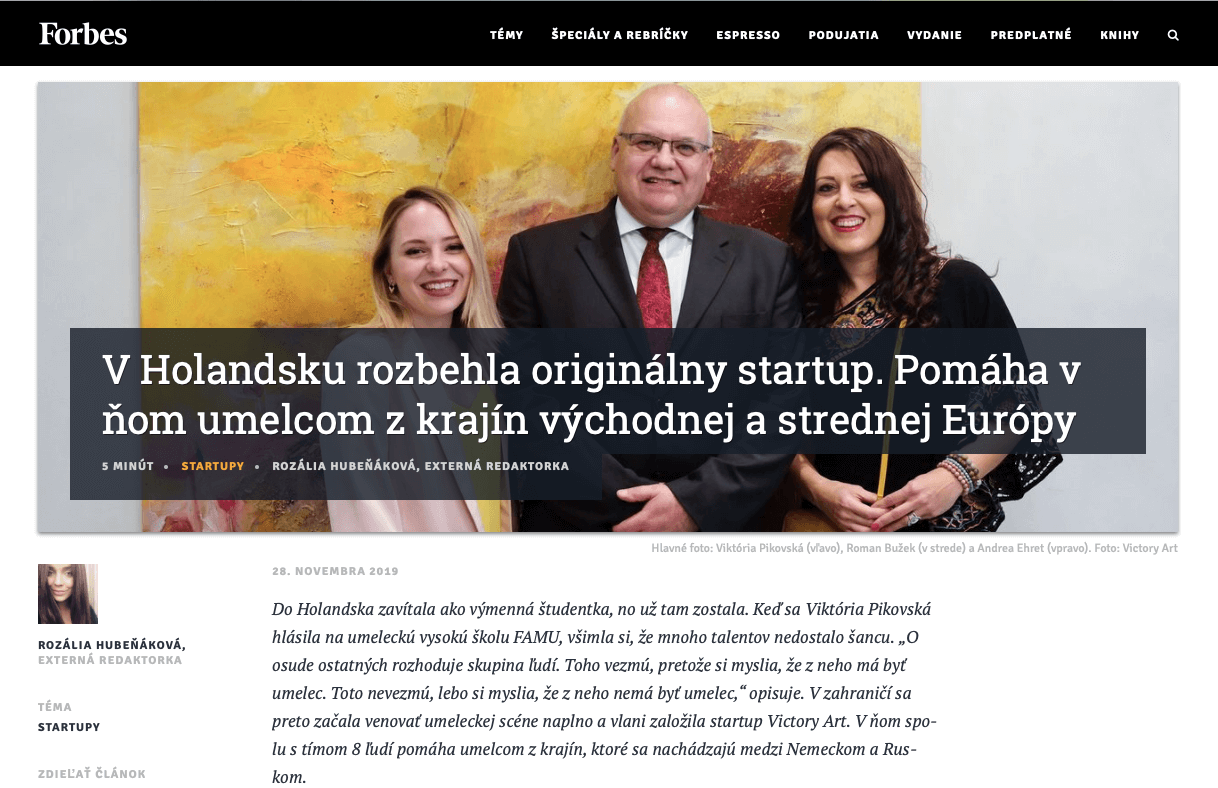 The Victory Art team continued to work hard. New talented artists joined us, we organized several exhibitions and networking events, we collaborated with female-owned businesses, and created more engaging content for you! We got published in Slovak Forbes!