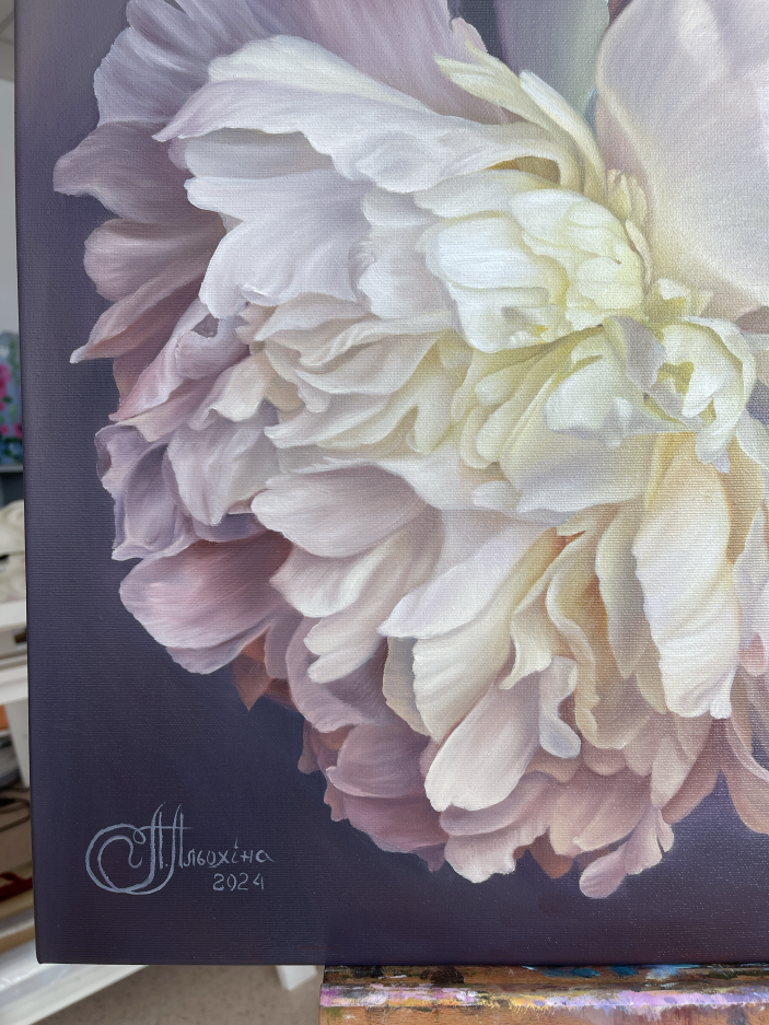 The painting depicts pink and white peonies, among which white peonies stand out. Their large, multi-layered petals open with amazing grace and ease, occupying a central place in the composition. White peonies amaze with their purity and sophistication, creating an impression of freshness and elegance.