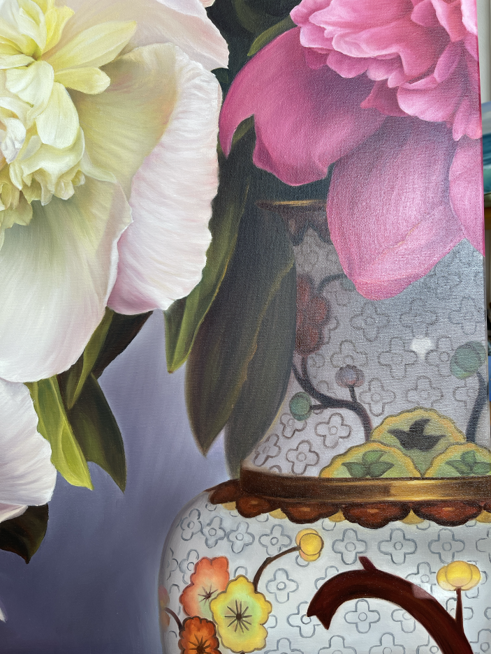 The background of the painting is done in muted tones, which allows the colors to stand out and draws attention to their beauty and detail. The general style of work can be described as realistic, which creates the effect of lightness and naturalness. Together, the pink and white peonies in the painting create a feeling of abundance and lushness, conveying the natural beauty of nature and evoking a sense of peace and admiration in the viewer.