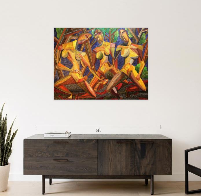 “4 Graces” is a surrealist painting created with oil on canvas. There are three female figures in the foreground, encouraging the audience to question the existence of the fourth Grace. Who is the fourth Grace? Are the figures in the foreground Graces? These are the questions the artist poses to the audience. Beautifully abstracted, it is painted in a cubist technique while the figures are still recognizable.