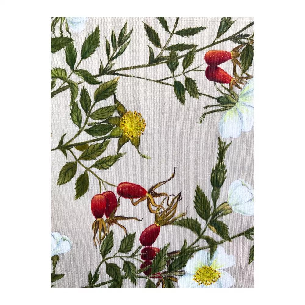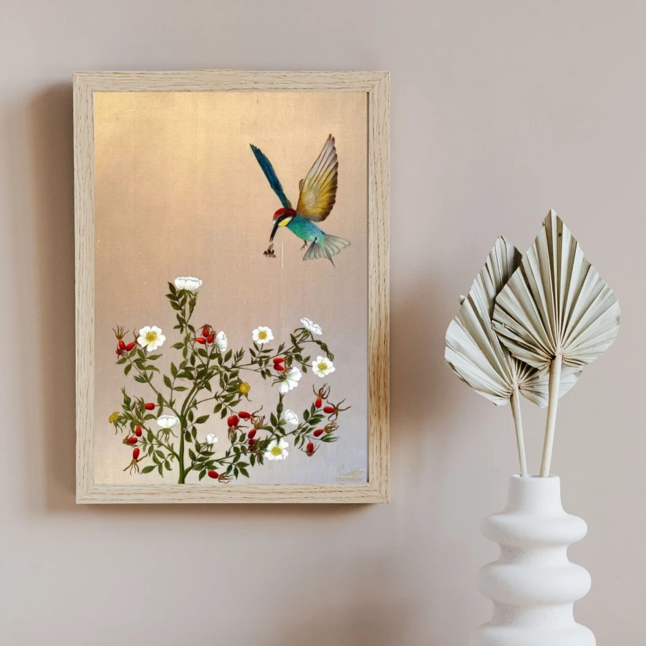 “A moment in our paradise” is a realistic painting with nature elements. The material used is silk (pure shantung silk with a texture that particularly reflects light in gold light) and the medium is mixed media. The artist meticulously painted a Bee-eater bird while catching a bee over a rosehip bush.