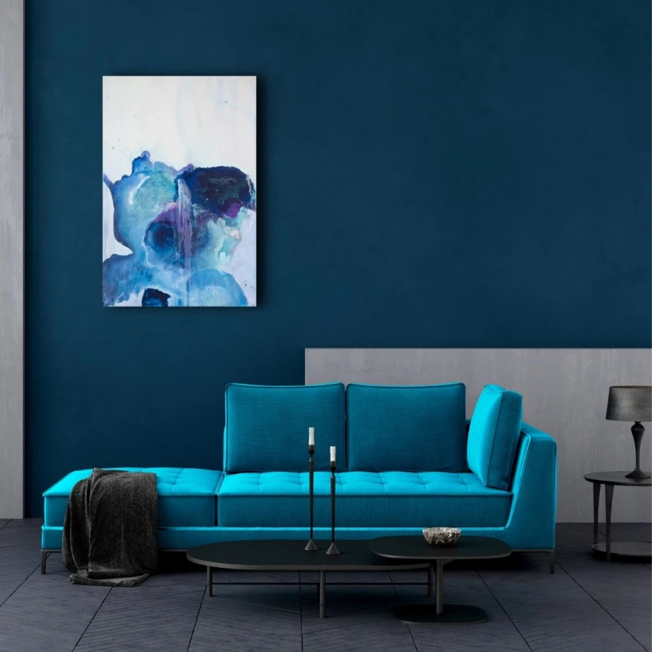 Painting with dyes used in microscopic examinations is exciting. Combined with oils and acrylic, unique colors and structures are revealed.In this art piece there are Intensive centralized abstract formations, surrounded with delicate tones of white and blue.