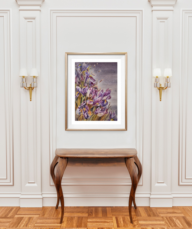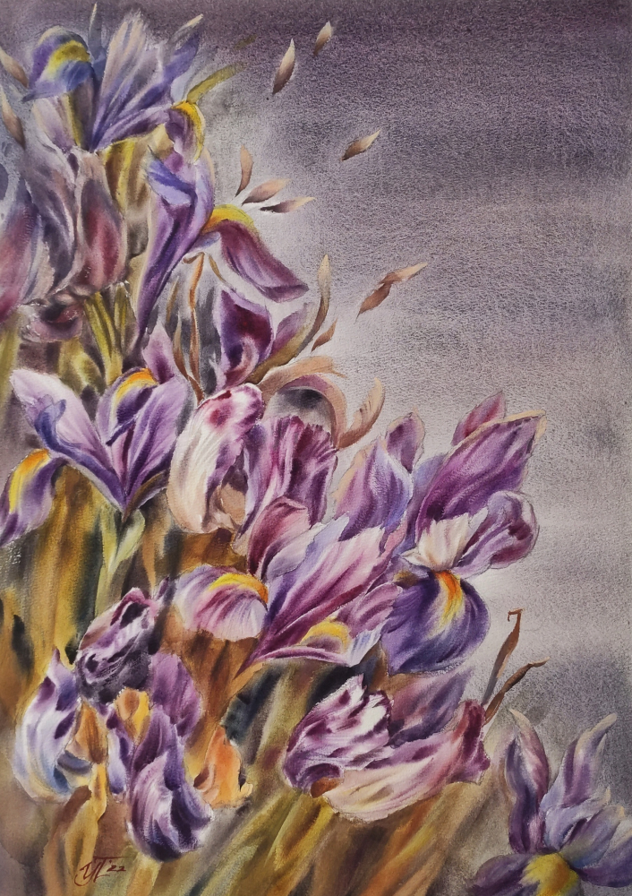 Watercolor painting with iris flowers made on cotton paper.