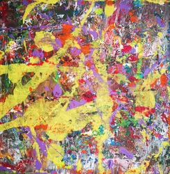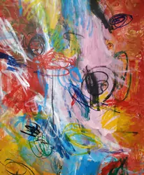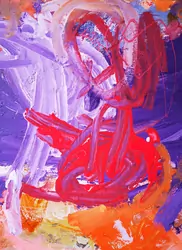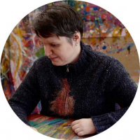 At the end of each session, she can be seen covered in the colors of her creation: she becomes her own art. Radical as it is, such an immersive method helps her during times of distress.