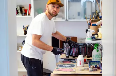 The process starts in Photoshop where I create digital painting. The application of line, texture, colour and form is uncontrolled and intuitive. After that I try to translate it to canvas. It is always a challenge to find an apt technique and prompts me to experiment. While the digital and analog media differ vastly there is an allure to both.