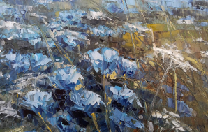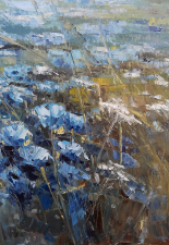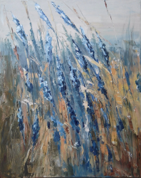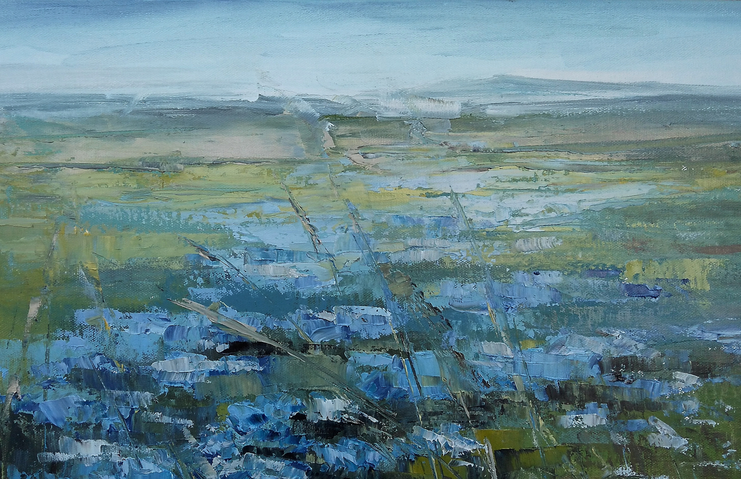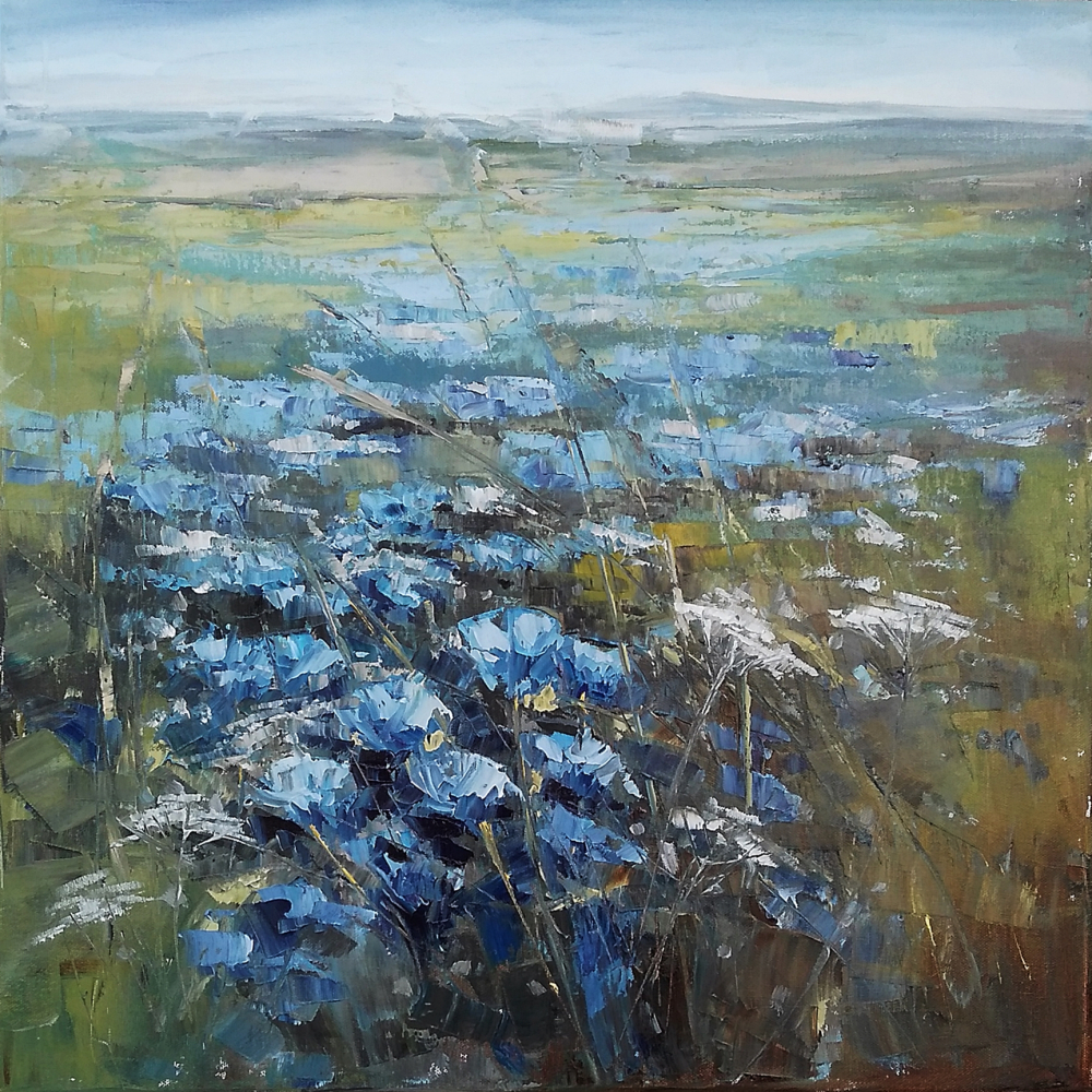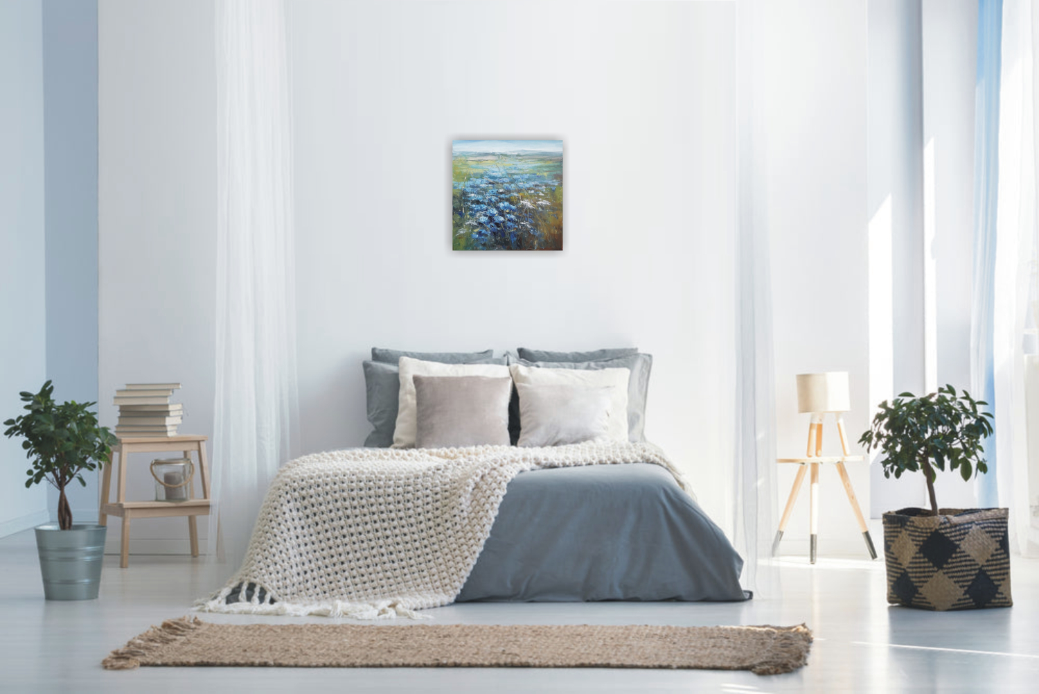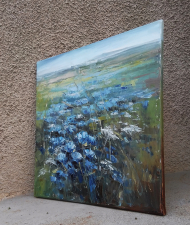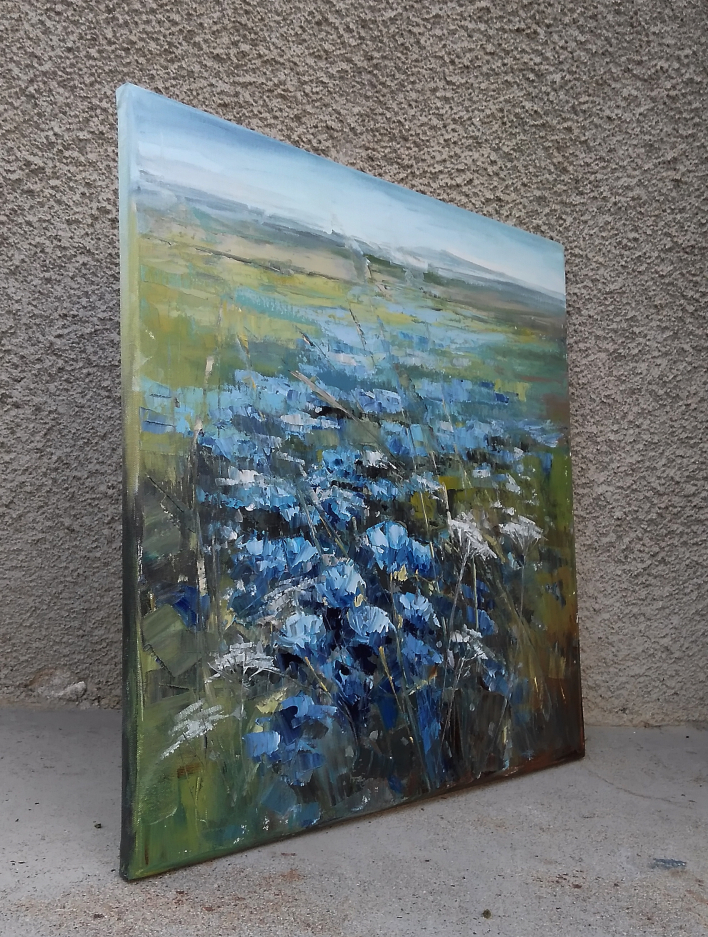 This painting is part of my field series. My freedom-loving personality was always been drawn by the fields. I love the feeling of endless, freedom and reverie that the fields evoke in me. I love painting them. While painting I feel the gentle wind playing all around me, I hear the whispers of the grass, I feel my soul floating towards the horizon… and I am happy. Hope you are too when looking at these paintings.