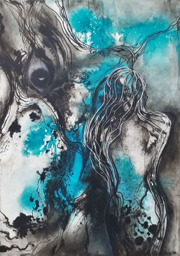 That quiet calm moment of awakening of a woman. Delicate blue shades show the mysterious moment of self-discovery. This painting can either show a woman figure, or, if you turn it upside down it resembles a man's face profile.