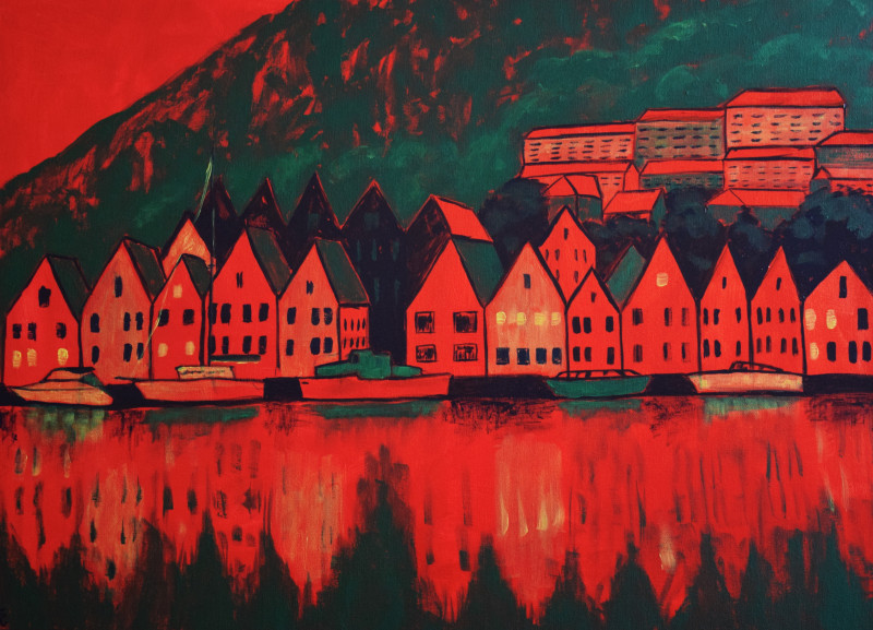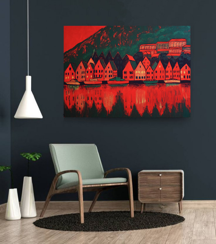 A large oil painting on canvas with a landscape of the beautiful town - Bergen.