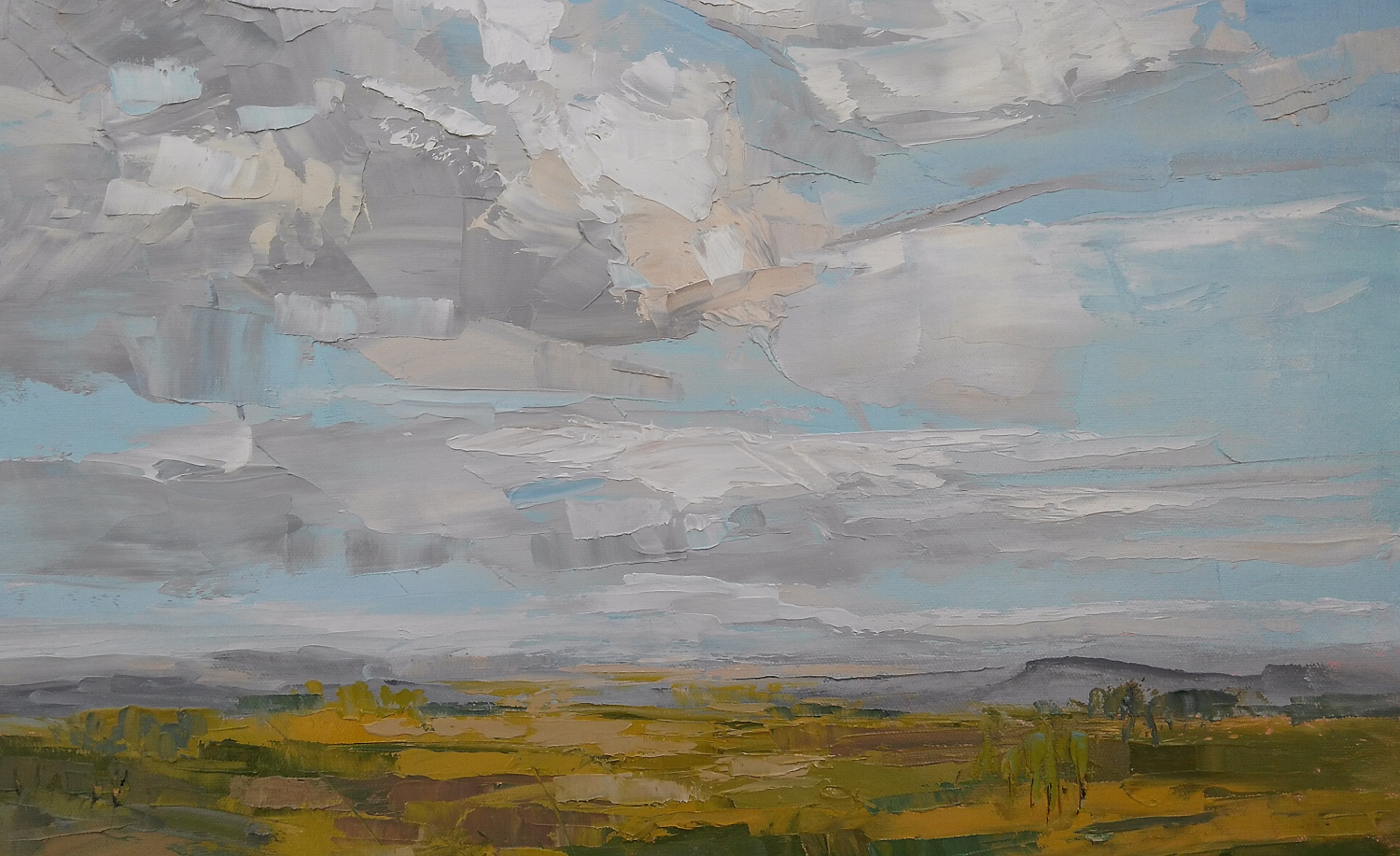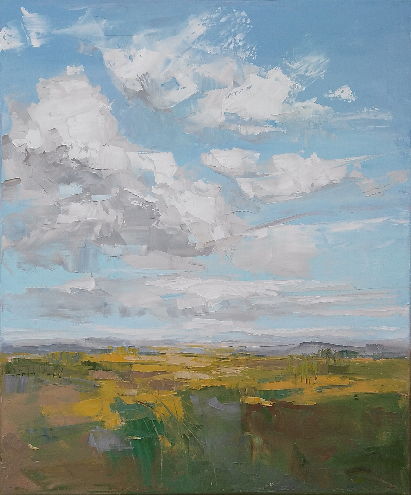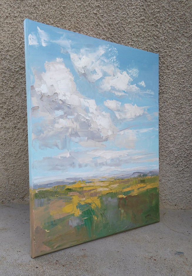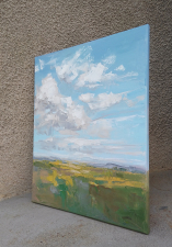 The sky has always intrigued me with its constantly changing scenes, colors and moods. I love clouds and I consider them alive and breathing. I see them free and powerful. I imagine them being in-love, mad, joyful, or just relaxing. I feel them talking with the ground, being connected with all creatures on the land, floating majestically above us all. They amaze me that much to dedicate them a new series of paintings of dramatic skyscapes.