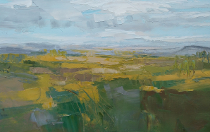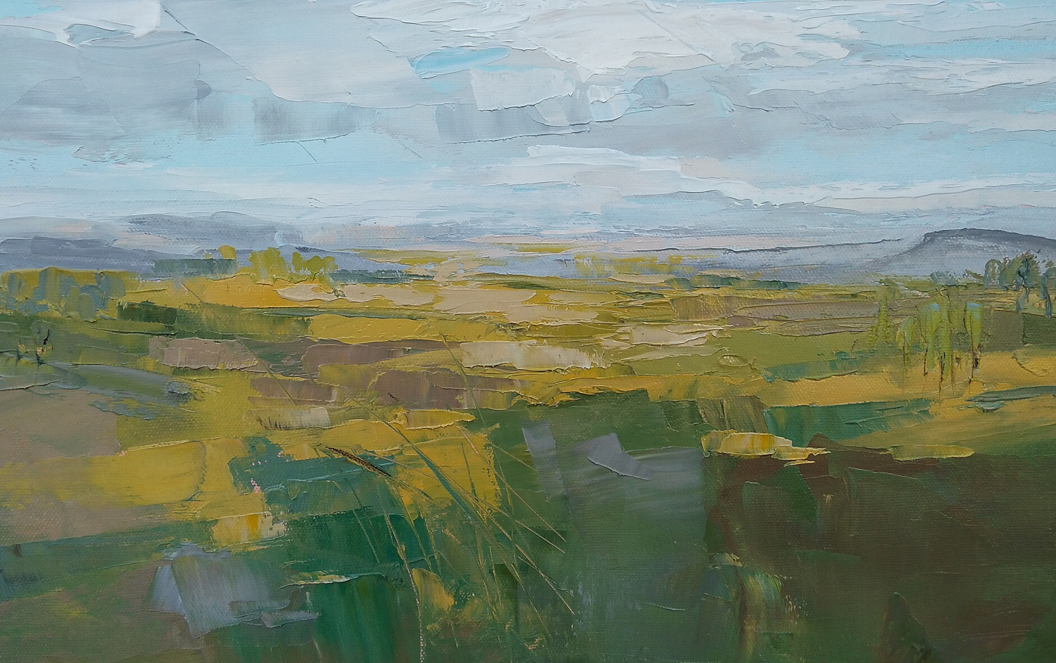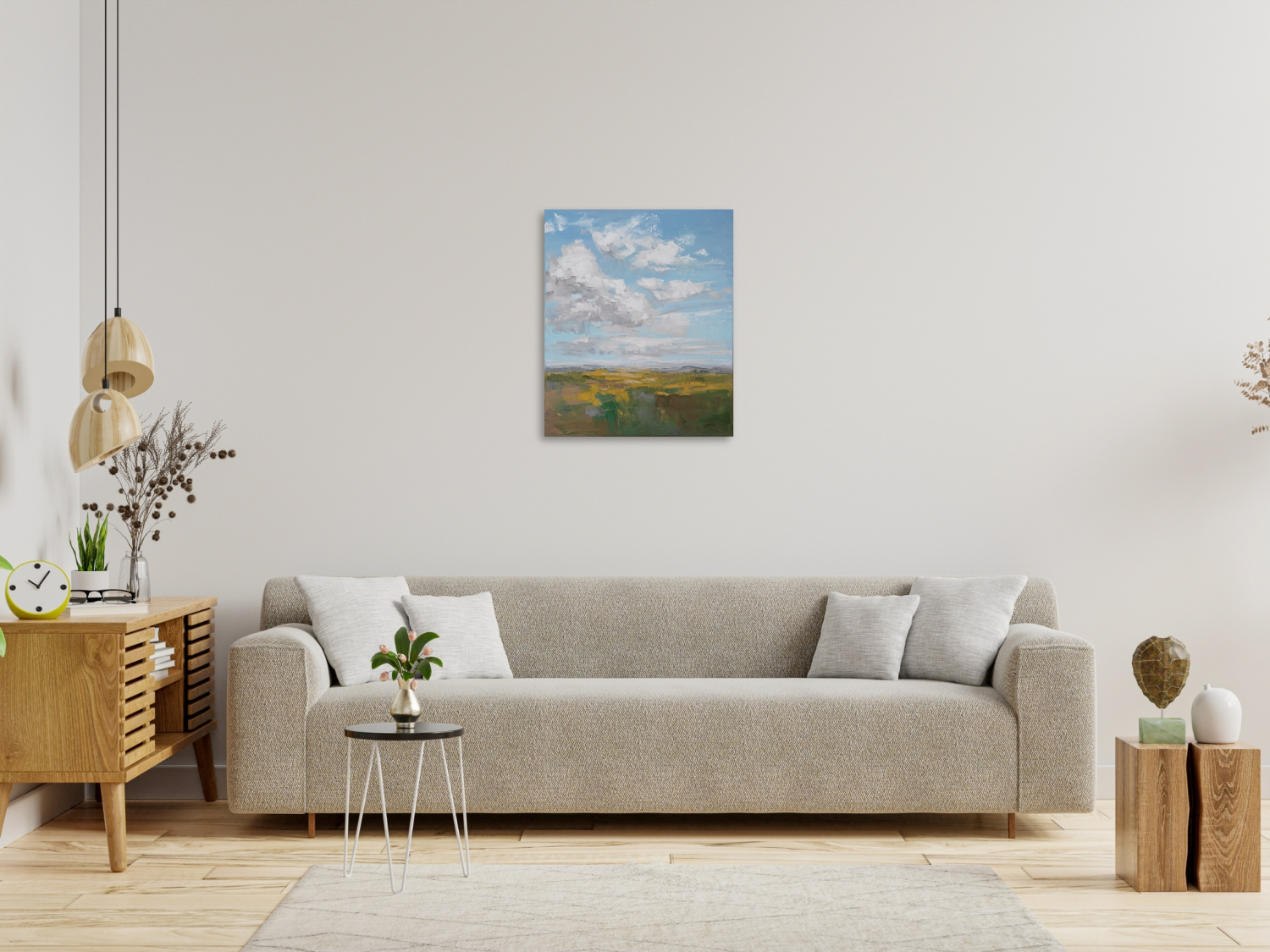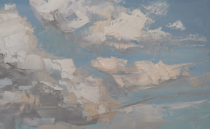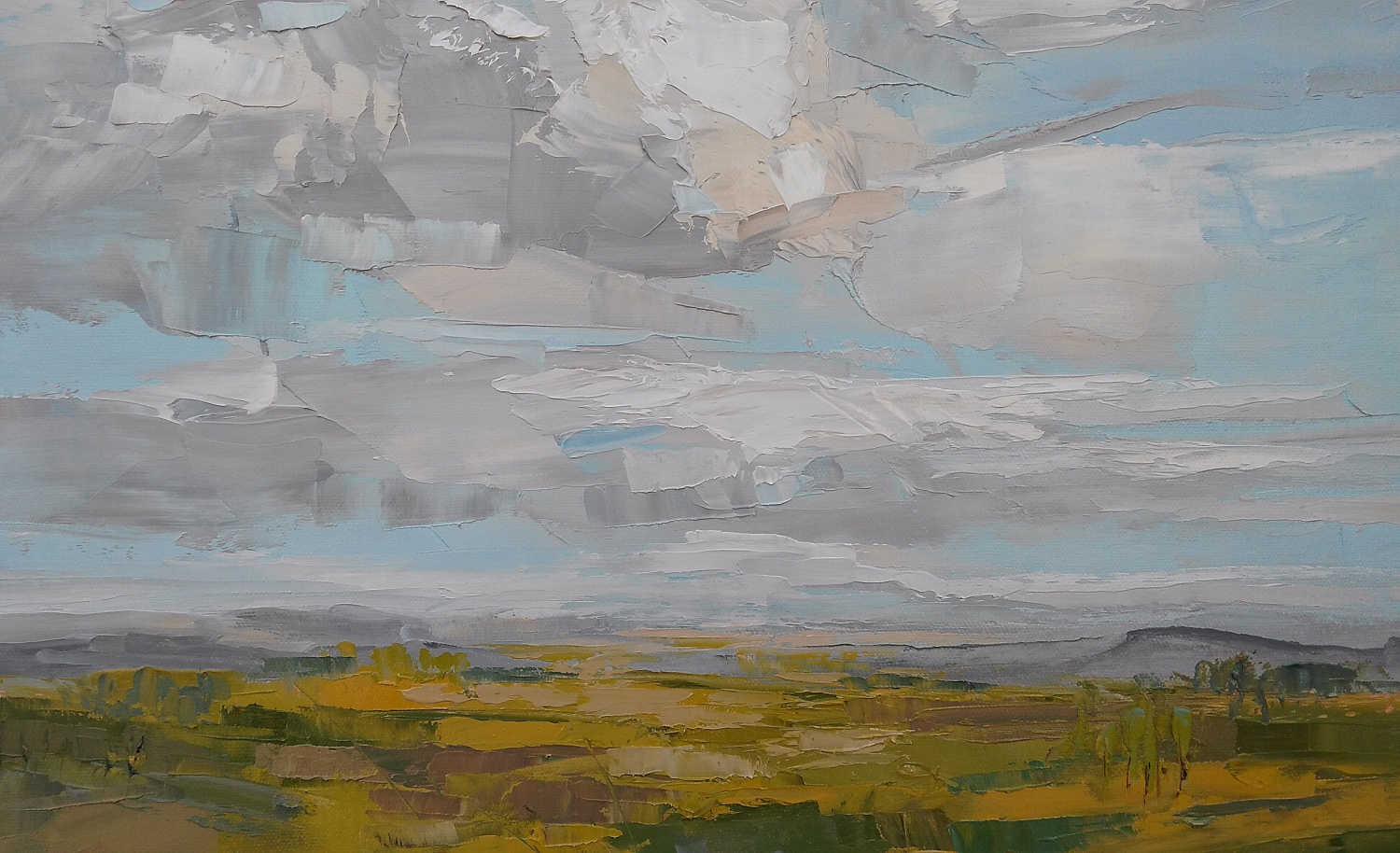 The sky has always intrigued me with its constantly changing scenes, colors and moods. I love clouds and I consider them alive and breathing. I see them free and powerful. I imagine them being in-love, mad, joyful, or just relaxing. I feel them talking with the ground, being connected with all creatures on the land, floating majestically above us all. They amaze me that much to dedicate them a new series of paintings of dramatic skyscapes.