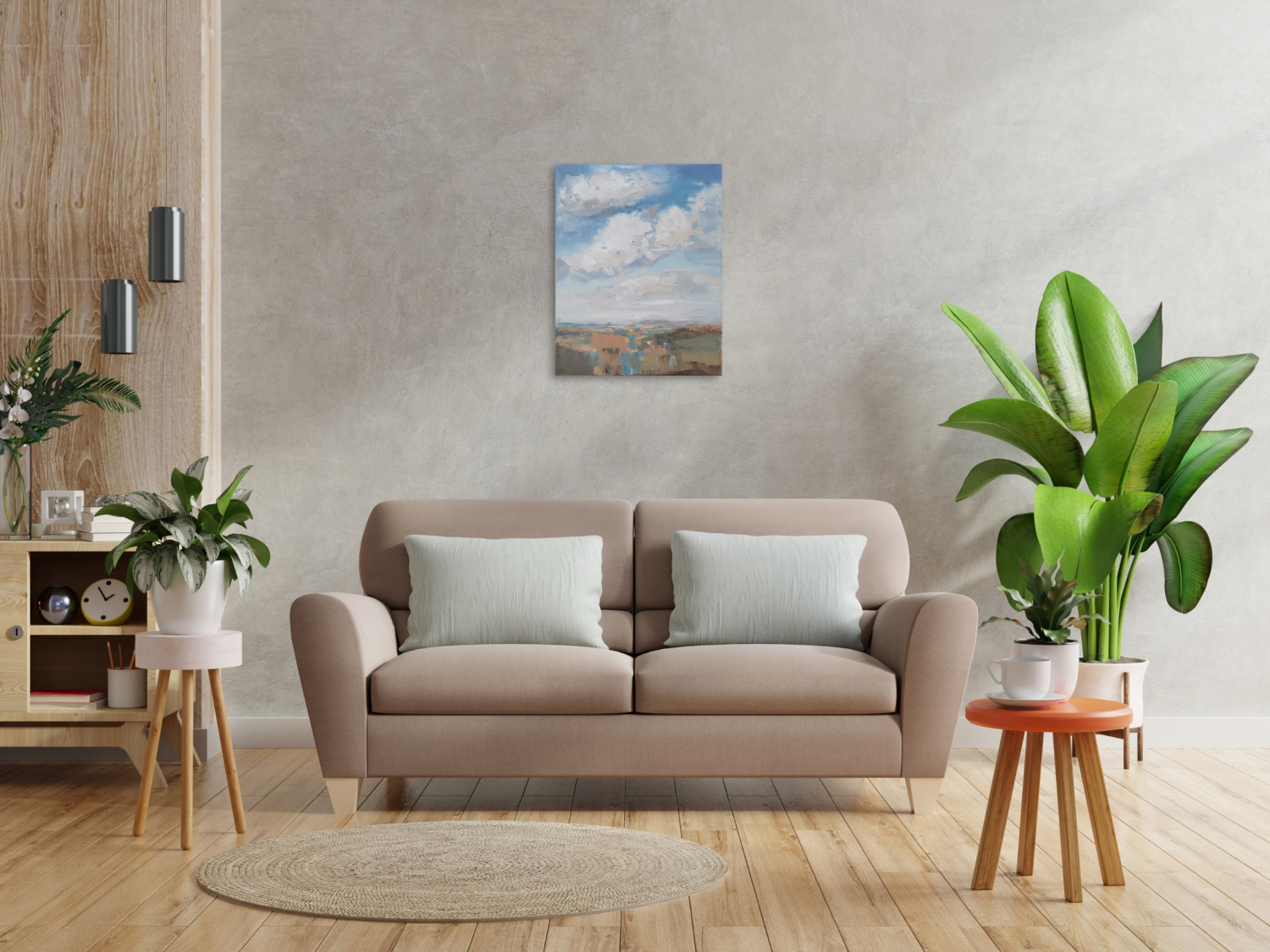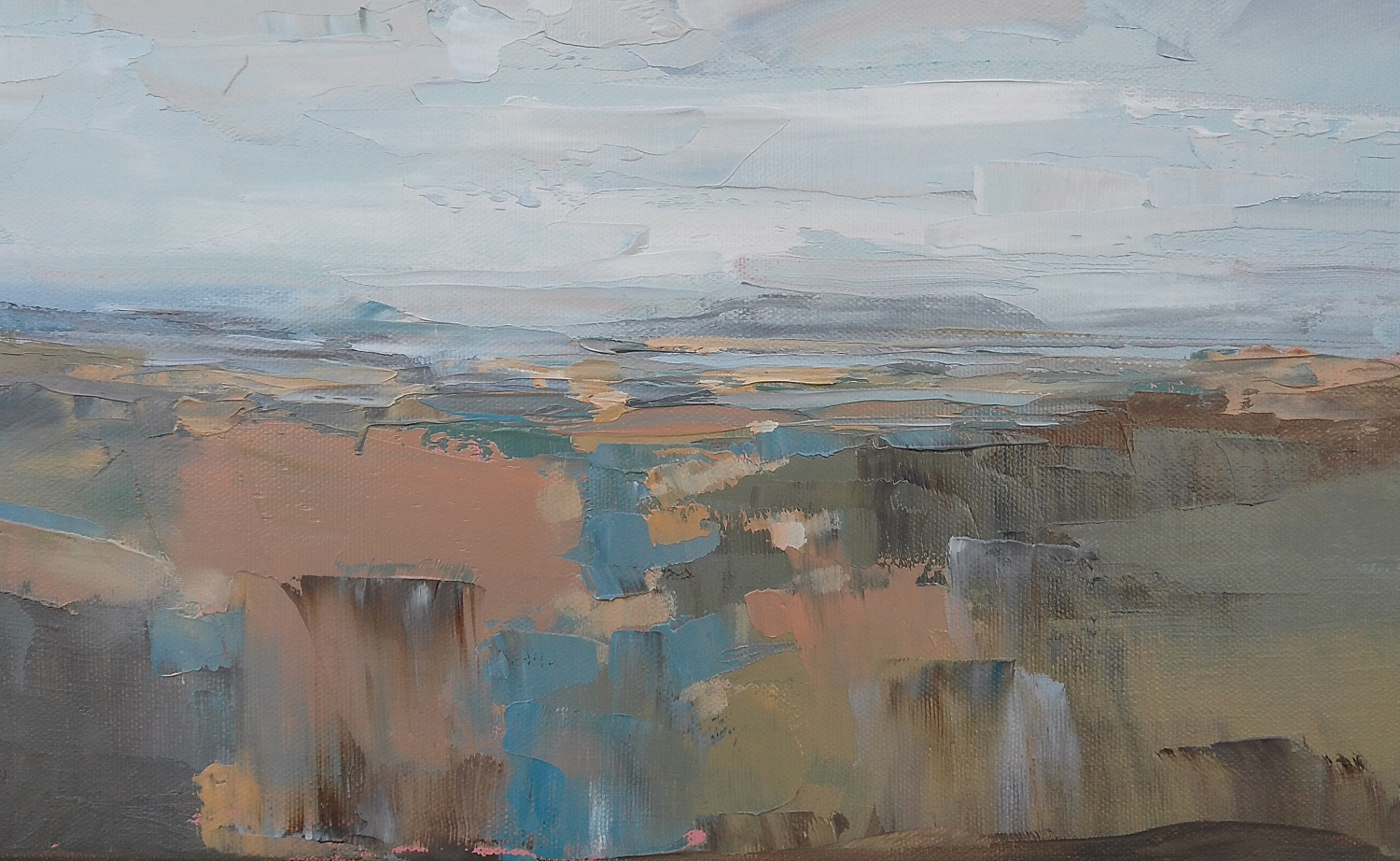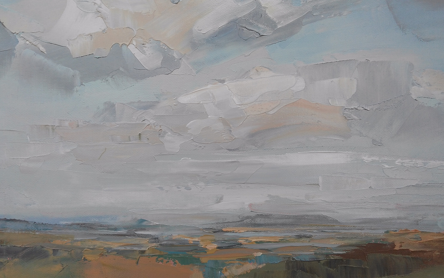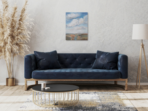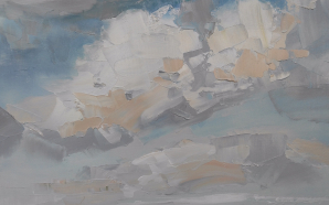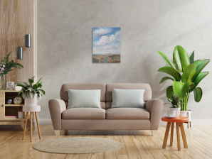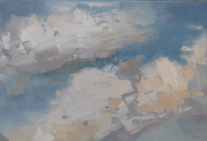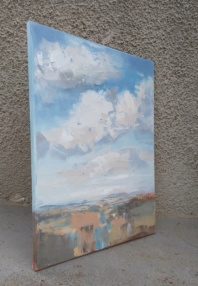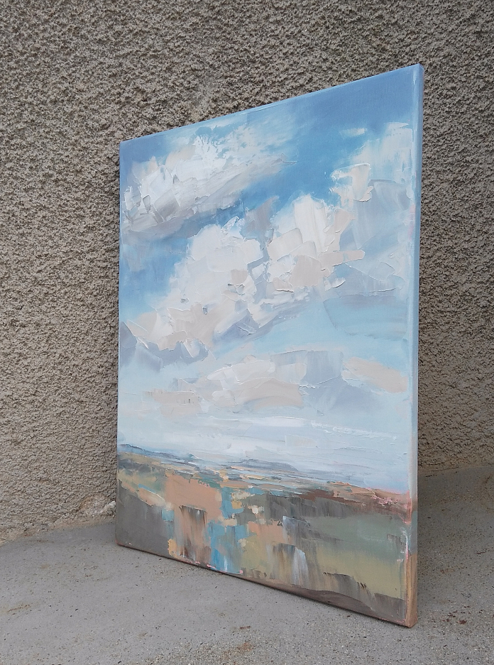 The sky has always intrigued me with its constantly changing scenes, colors and moods. I love clouds and I consider them alive and breathing. I see them free and powerful. I imagine them being in-love, mad, joyful, or just relaxing. I feel them talking with the ground, being connected with all creatures on the land, floating majestically above us all. They amaze me that much to dedicate them a new series of paintings of dramatic skyscapes.