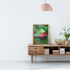 Birth is an acrylic painting on canvas with an expressionistic and abstract style. With the eye-catching design and the beautiful color red, green, yellow, and lines of black, your spaces could get an entire new atmosphere! With the size of 50x40 cm you don't have to worry, it would fit any kind of space!