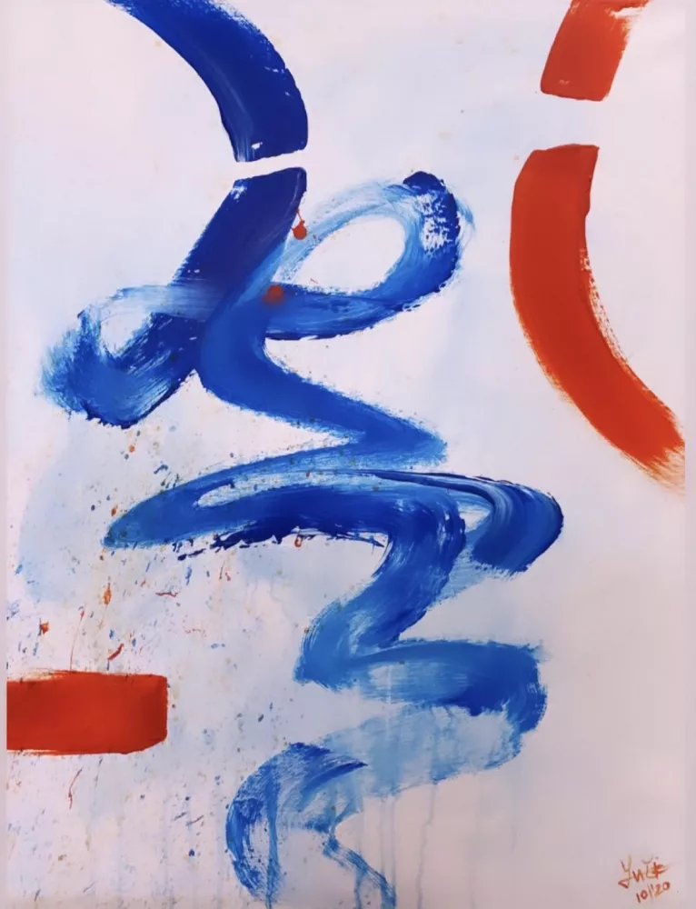 I have found that every one of us sees the borders differently and this very painting was created thanks to this thought. The blue line symbolizes everyone's own way. The red color indicates the paths that are out of the right way and that every one of us crosses the border from time to time.