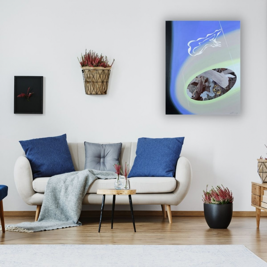 The images inside the eclipses represent various collages from everyday life with everything it brings, including small visual absurdities, animals, or musical and historical suggestions. Through each painting, there is an aspiration for the contact and connection with the universe and time, through human, natural, and animal elements from the earth. Colors create the core phenomenon here. The tones and intensity, as well as the subtle shading, emphasize the mysticism of the universe.