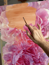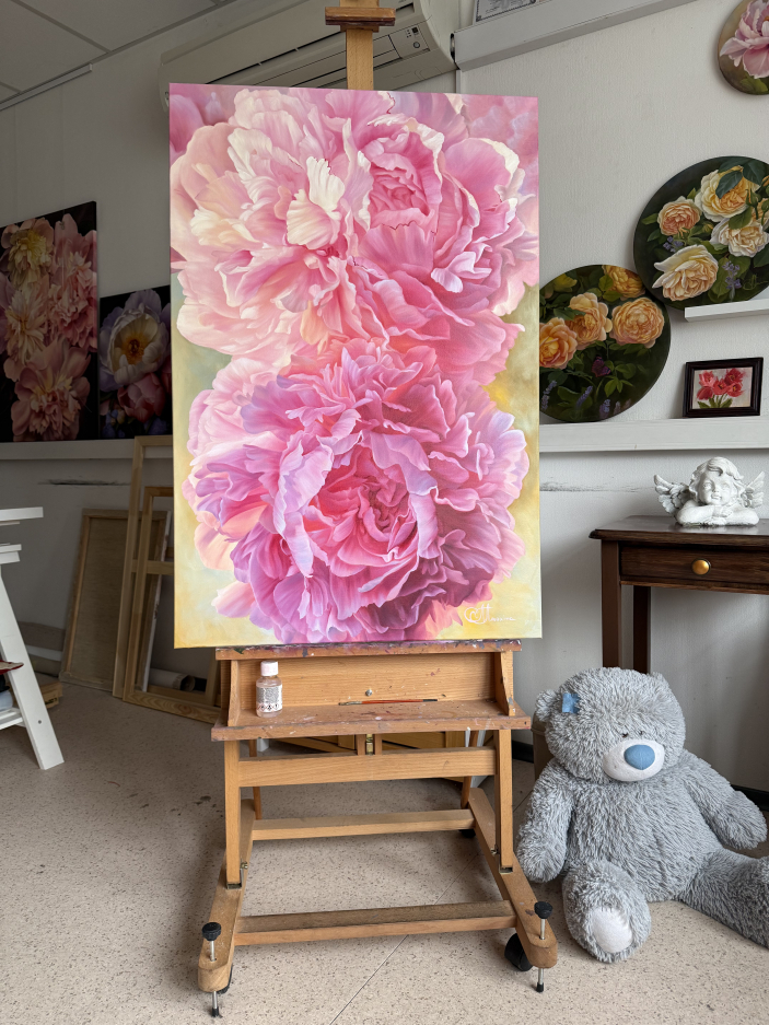 In this painting, the artist explores the harmony of color and light through the image of peonies—symbols of generosity, beauty, and renewal. Soft transitions of pink and pearlescent tones create a sense of depth and fluid movement, as if the flowers are coming to life before the viewer's eyes. The work exudes tranquility and tenderness, embodying the vibrant energy of full bloom. It fills the space with warmth and serenity, creating an atmosphere of inspiration and harmony. Perfect for a contemporary interior striving for lightness, natural elegance, and an emotional response.