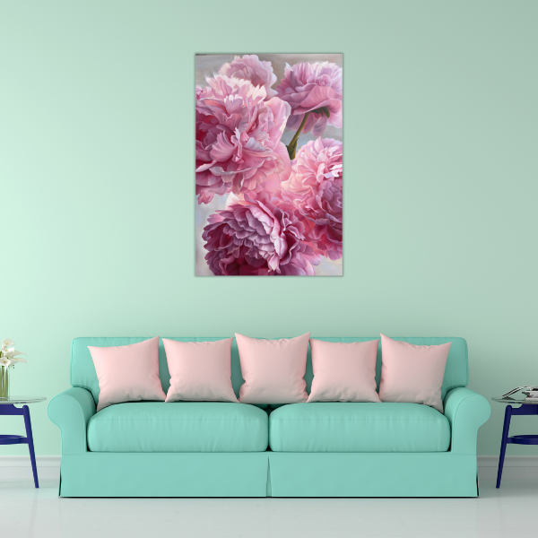 Before us is an oil painting depicting magnificent peonies in various shades of pink. The artist masterfully conveyed the layered petals: from delicate pearly tones to rich crimson, creating a sense of living volume. Each flower seems to breathe, revealing its beauty in the harmony of light and shadow. The background gently dissolves, emphasizing the lushness of the peonies and giving the painting a feeling of lightness and infinity.