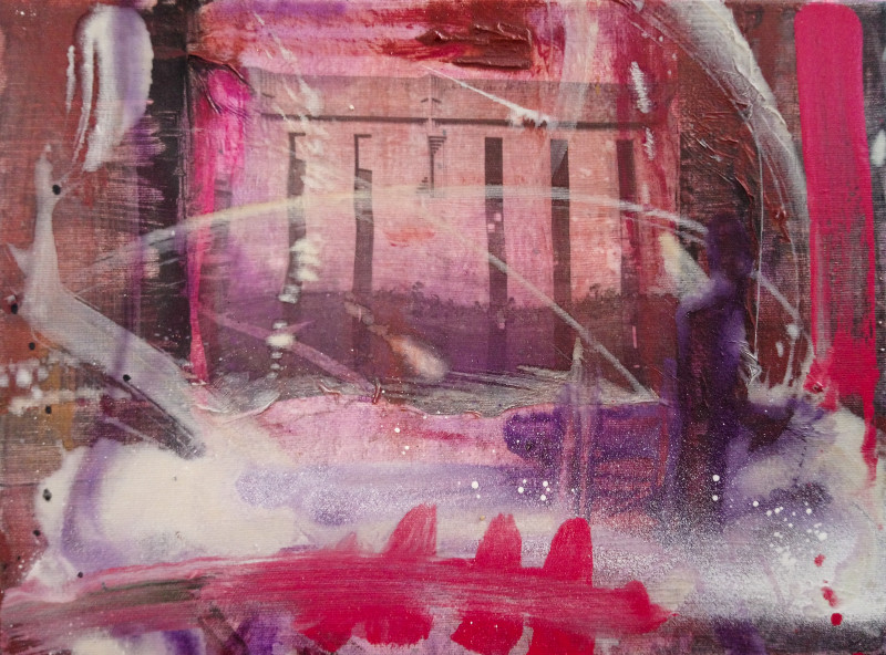 Medium is a mixed media oil, enamel, spray paint, paper, and plastic film, made by transferring the image from paper and blue oxide. Material is a canvas on wood with paper and plastic film glued on.