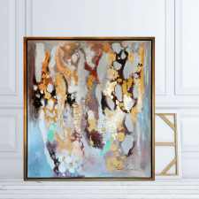 The artwork is stretched on a wooden stretcher and ready to hang. It is framed in a wooden floating frame in a golden hue.