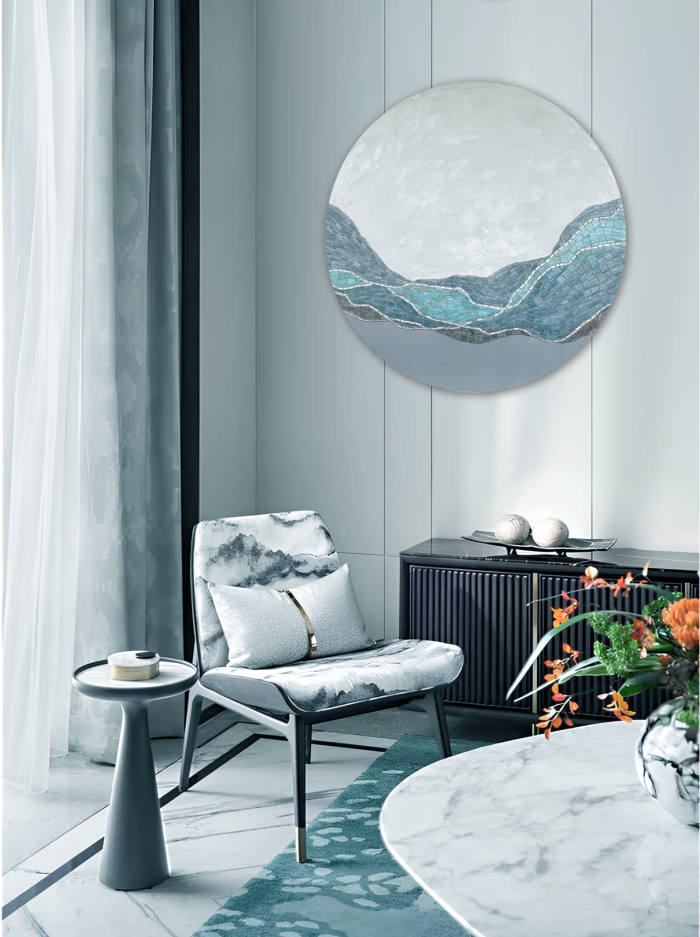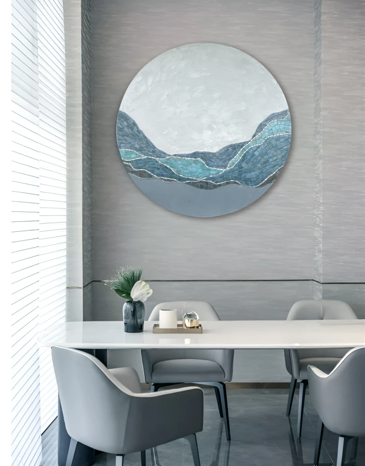 Hand cut with glass and silver glass mosaic, it is a sophisticated touch to a contemporary interior. The background is "silk" paint.