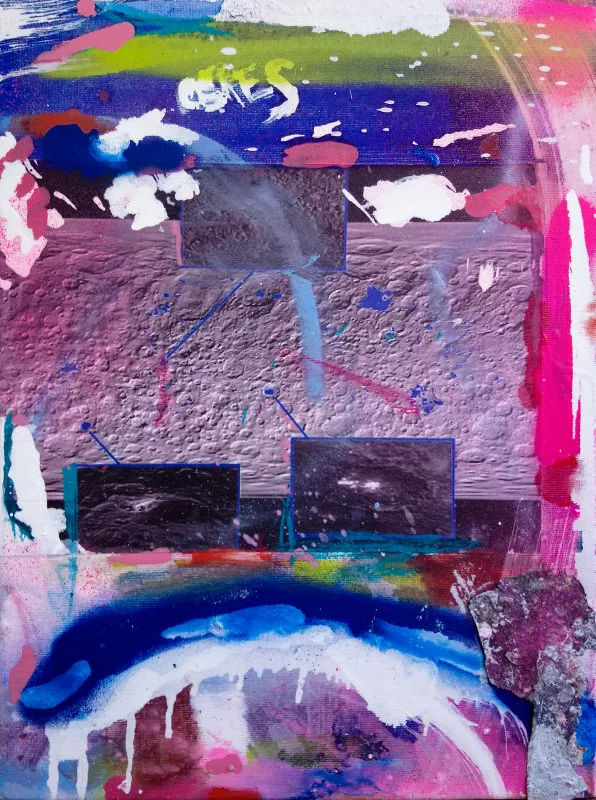 Ceres is a mixed media on canvas with an expressionistic and abstract style. The medium is oil, spray paint, paper, and a plastic film made by transferring the image from paper and blue oxide. The material is a canvas on wood with paper and plastic film glued on.
