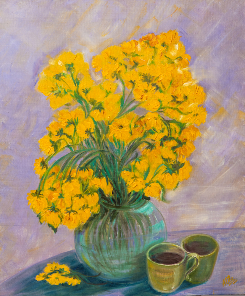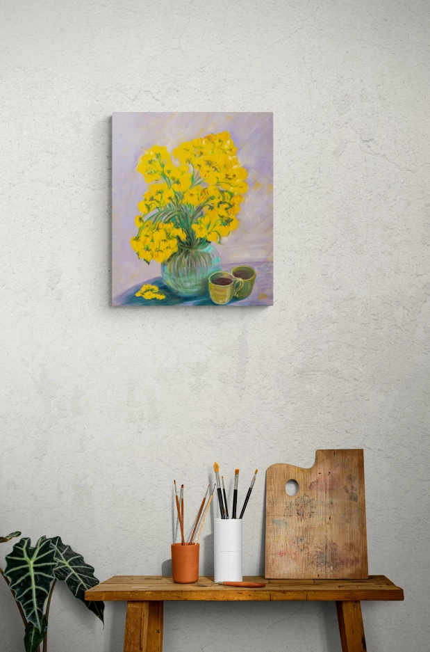 But in any case it is up to you. The painting is minimalistic in colors, but I tried to fill it with maximum energy, warmth, and a sense of comfort and home romance. That's why I chose yellow flowers. I was inspired by chrysanthemums, coffee, and coziness.