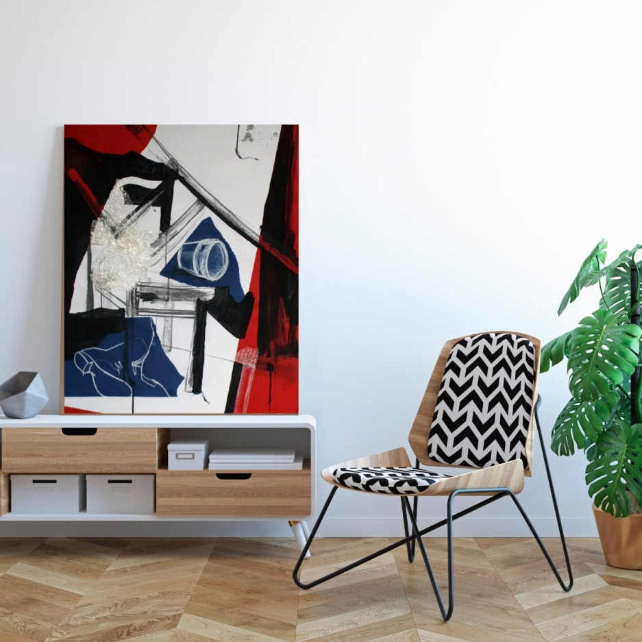 Collage based on still life. A dynamic monochrome composition created on red paper. It combines many structures creating a spatial image. Objects found in the studio become the subject of the work, fragments of scraps of paper or packaging create a dimensional composition with many surprising combinations. The elements eclectically combine to create a unity and harmonious whole. Playing with structures makes the composition light and the longer you look at it, the more flavor you find.