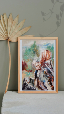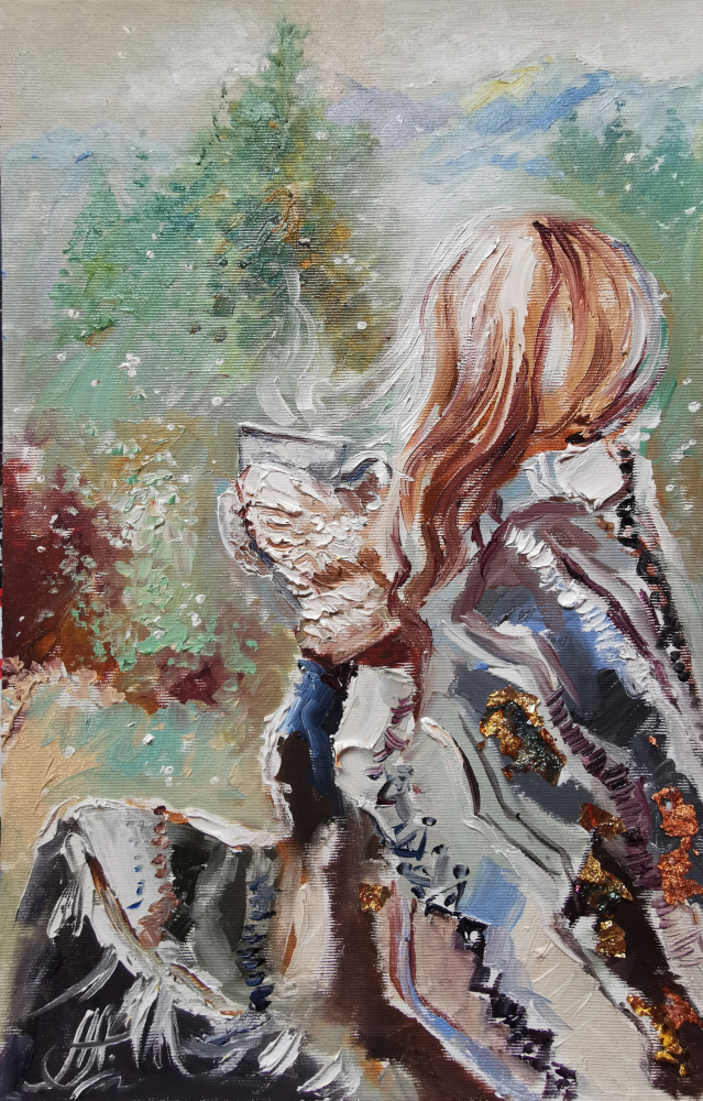This original painting inspired by a wonderful day in the coniferous forest was created in oil with metal leaf on a high-quality linen canvas. The painting will immerse you in the mood of upcoming winter and warm feminity.