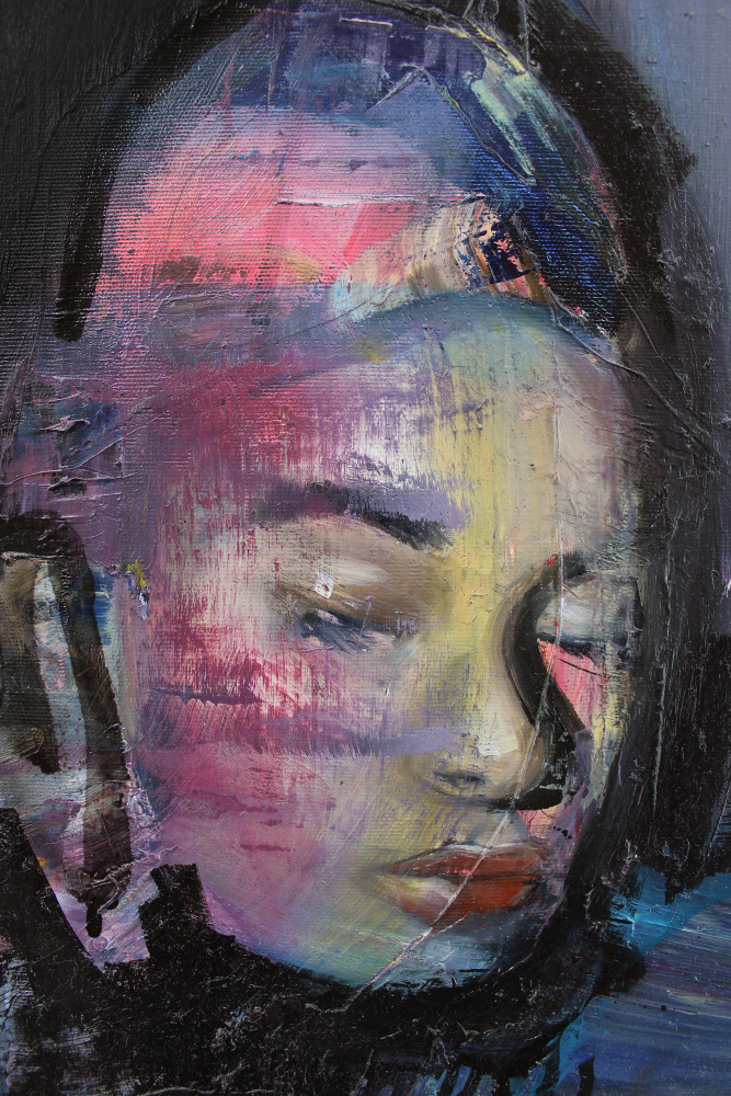 Calm parts of the painting alternate with violent, gestural strokes. The slow-drying oil is later contrasted with quick-drying acrylic and spray.