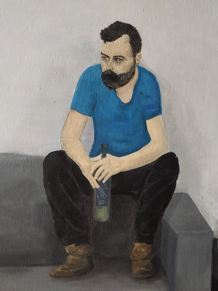 Conversation with yourself is a realistic acrylic painting of a portrait on canvas. With this painting the artist wants to say that sometimes the best thing you can do is to sit in front of yourself and talk honestly.