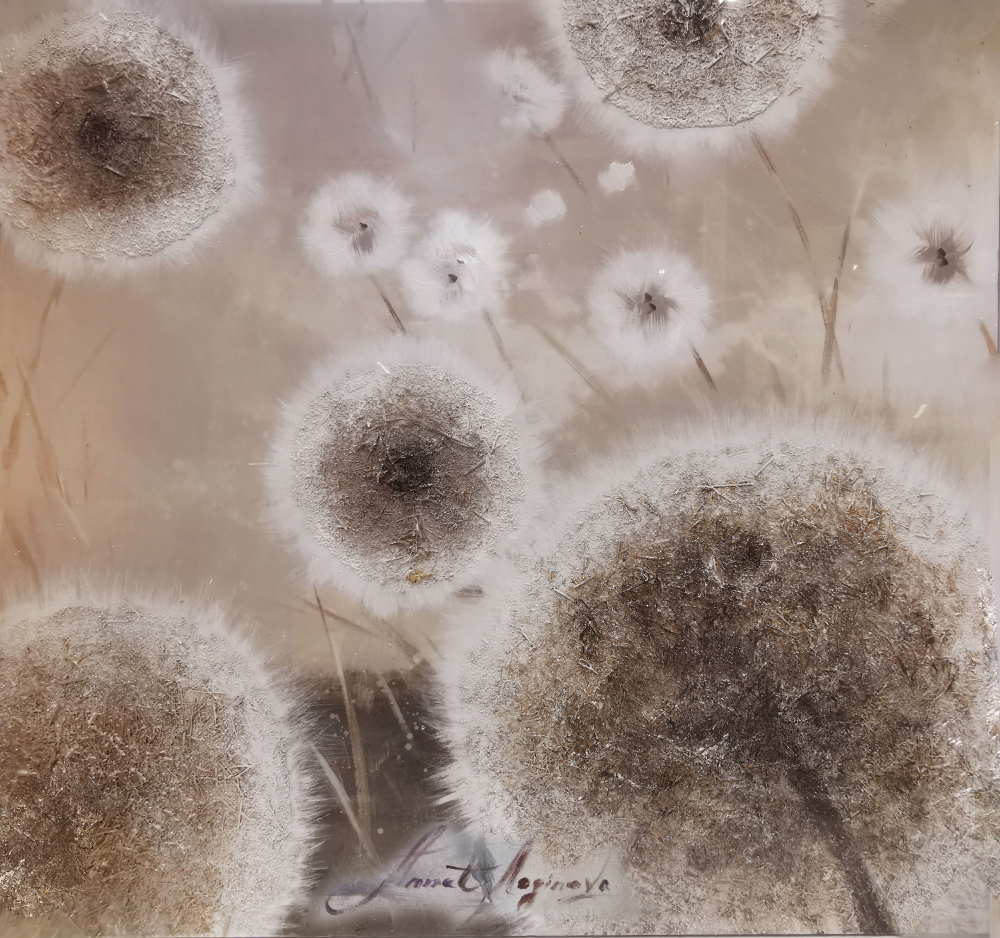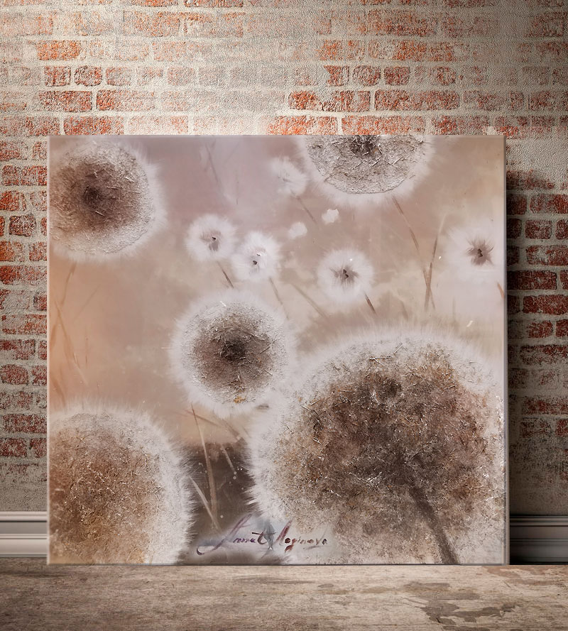 This large abstract painting features a play of textures: oil & acrylic paints, dried herbs. You can feel the rich textured surface with your fingertips. The painting in brown pastel colors depicts tender dandelions in the wind. This artwork would be a stylish and gorgeous decoration for modern interiors. It is also a wonderful gift for your family, your loved ones, friends, colleagues.