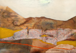 This painting was full of gestures and feelings, then I paint it down and it became a fount in the desert. The way the colors shaped the canvas, which reminds me of a map detail, like actually a desert. A bleak, grey, rocky desert with a mirage oasis.