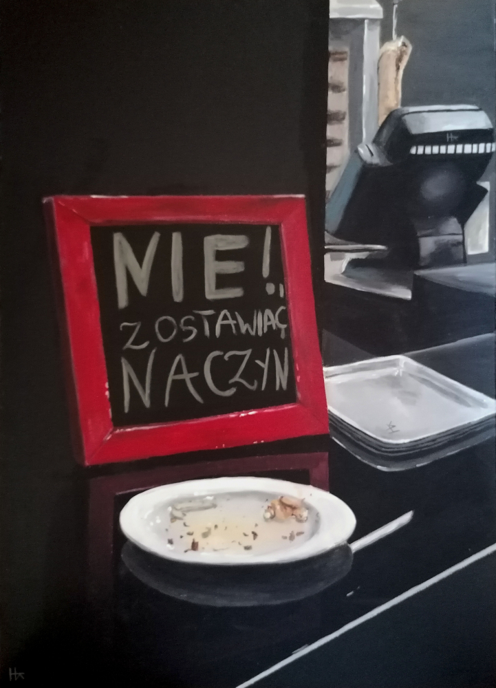 This realistic artwork depicts a sign that says “Do not leave dishes!” in Polish. This moderately sized painting can alternate in any room in your house or office space.
