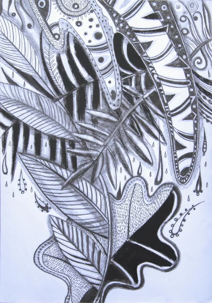 Black on white, inspired by nature, drawing with chalk, charcoal, pastel and pencil.