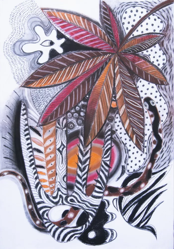 Autumn, inspired by African nature, drawing with chalk, charcoal, colored pastel and pencil.