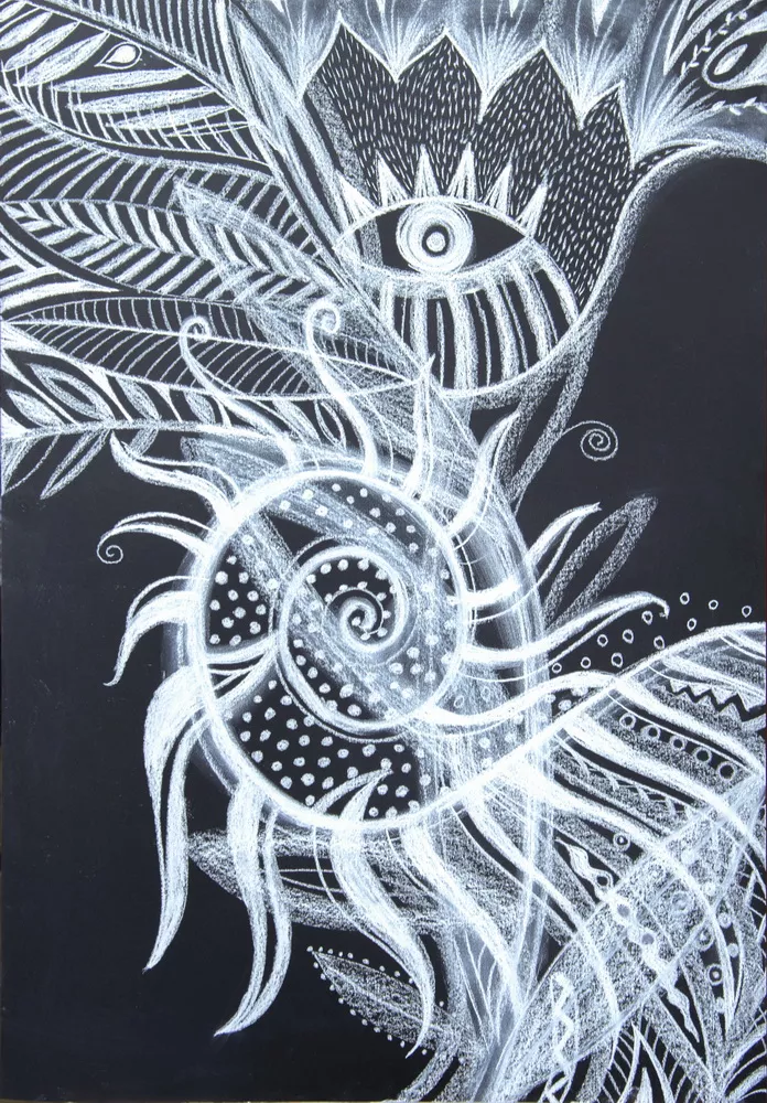 White on black, inspired by African nature, drawing with chalk, pastel and pencil.