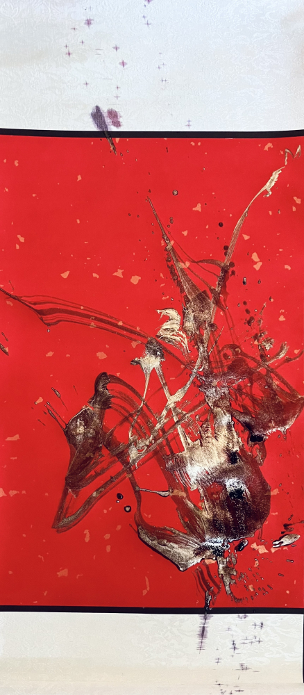 The red Japanese sumi-e scrolls, enhanced with brocade and subtle gold particles, evoke a sense of abundance and joy. In Asian cultures, red symbolizes prosperity and vitality, imbuing the work with an enduring sense of richness and life.