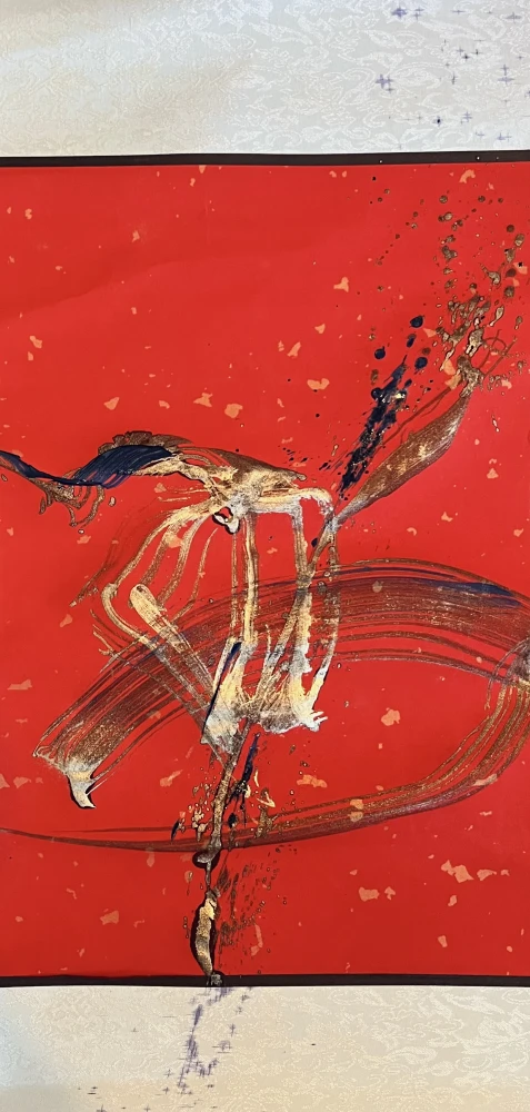 The Japanese sumi-e red scrolls, adorned with subtle gold particles and framed by brocade, evoke a sense of abundance and joy. In Asian cultures, the color red symbolizes prosperity and vitality, infusing the work with a deeper, positive energy.