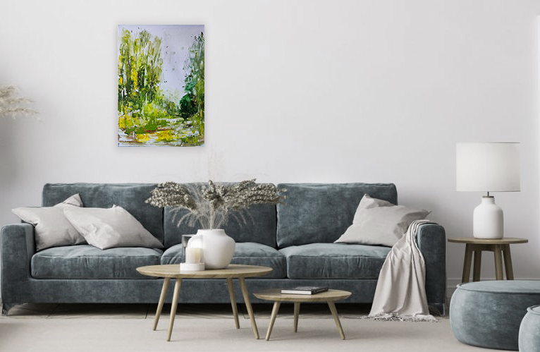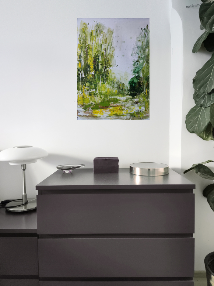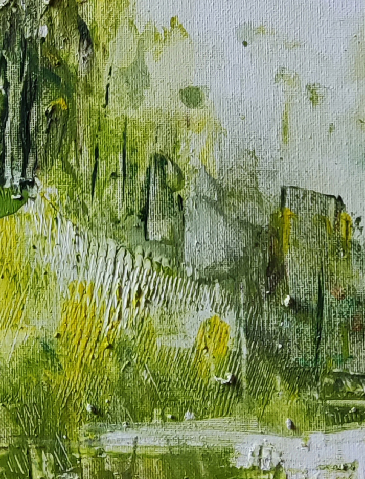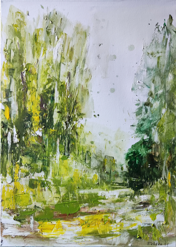 It is a festive Sunday atmosphere in the Danube floodplains. The families decided to have a picnic in the grasses. I have to look for a long time for a free, deserted place for my needs, where I can listen to a bird chirping. Everything is as it should be. The yellow color is predominantly visible and nature has lost all contrasts. The trees stand proudly in the landscape and their leaves do not move in the calm of the wind. I have memorized a meadow with tall grasses as inspiration for my new work of art. I push the colors from the tube to my palette. Everything is created by itself. All brush strokes find a natural order and the right place.