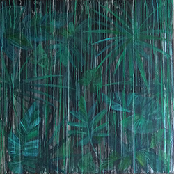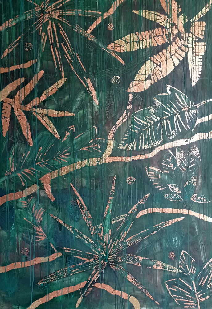 Tropical shapes and flow of color, rich mix of close colors, and rain mood. Golden foil shiny effect