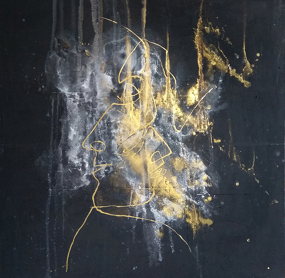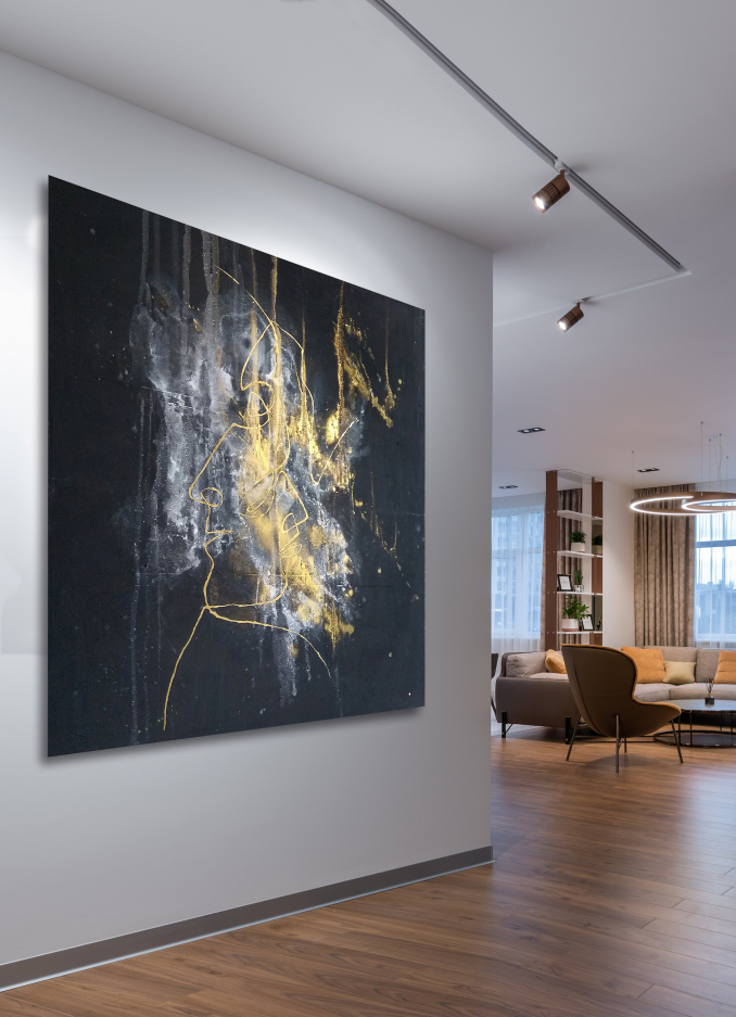 This abstract painting is inspired by golden reflection shine. The golden line creates two faces, every face is inside the other as a symbol of reunion. Black, white, and gold are the main colors creating a luxury aesthetic. The art piece comes in the size of 150 x 150 cm and was painted on canvas with acrylics.