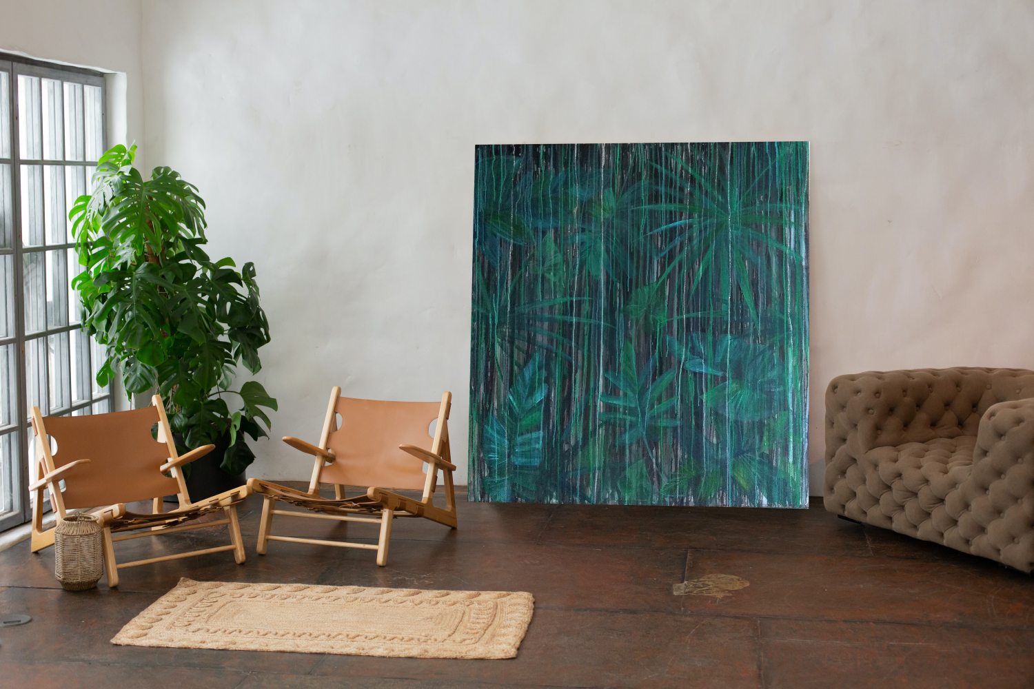 “Summer Rain” is an abstract painting inspired by tropical places. The leaves have a rich mix of close colours while the white lines put you in a rainy mood. The art piece comes in the size of 150 x 150 cm and was painted on canvas with acrylics.
