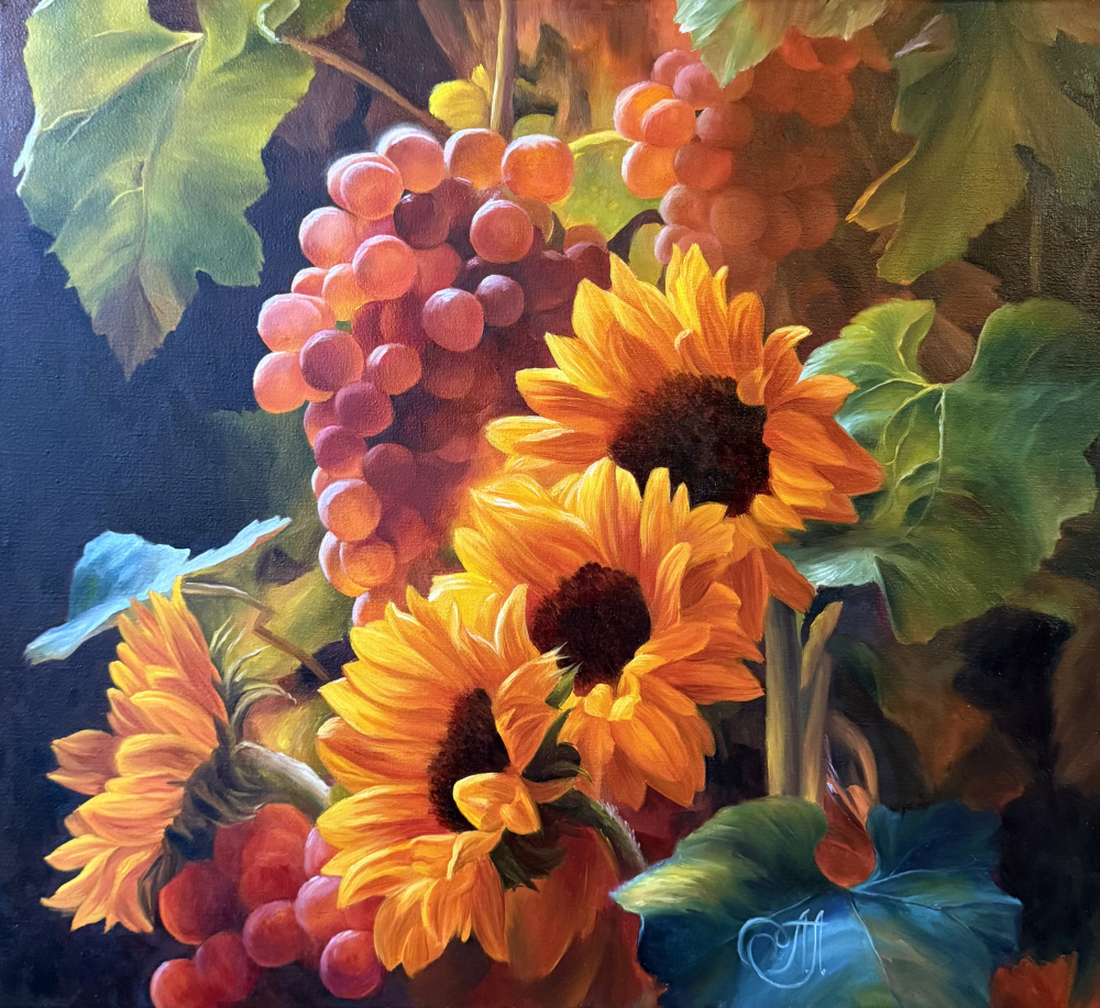 «Осеннее золото» — это ода щедрости природы и свету, рожденному на стыке лета и осени. Подсолнухи, сияющие теплом и силой, переплетаются с тяжелыми гроздьями винограда — символами изобилия, зрелости и полноты жизни.Need more help?