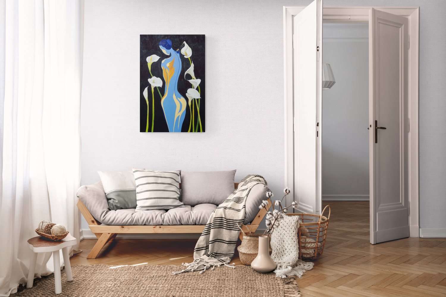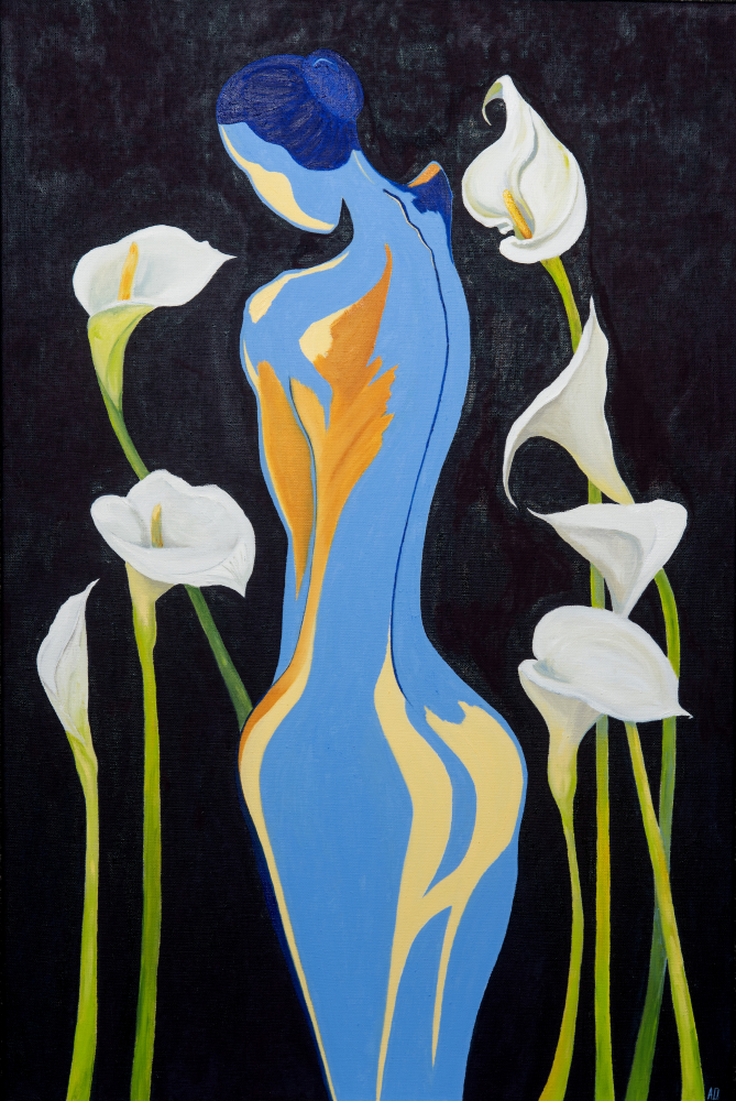 The artwork depicts a female figure alongside calla lilies and is part of my series titled "Femininity," which I started working on in 2018.