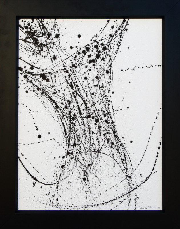 The painting invites to reflect on being and on the body-mind bond, but also on the woman figure and feminism, given the subjects represented. The technique used in these paintings is mainly action painting, a "dripping art" procedure inspired by the Jackson Pollock method, but instead of totally abstract and informal result, it has a strong figurative characteristic. The color, ink, in this case, is spontaneously splashed and drained over the surface of the painting.