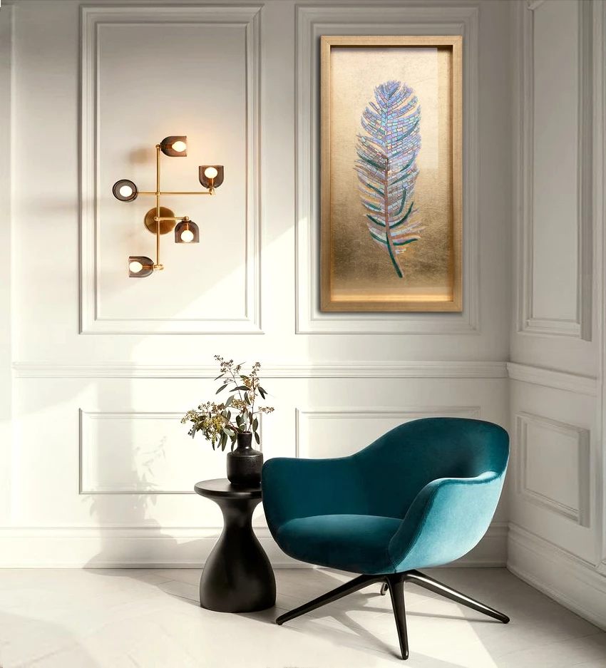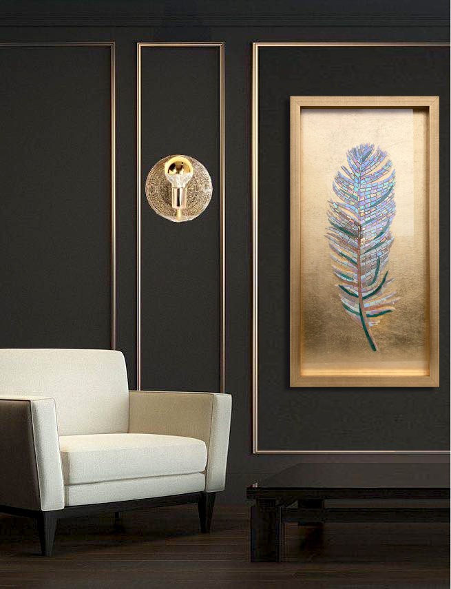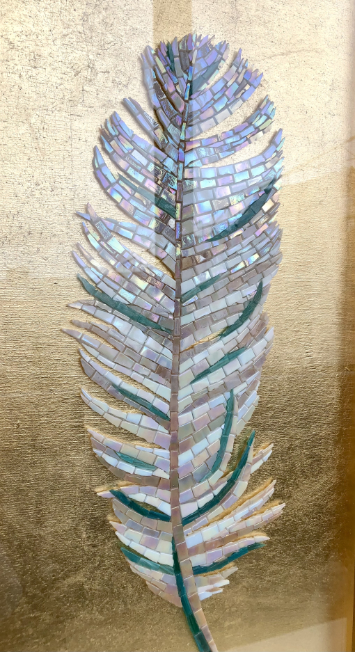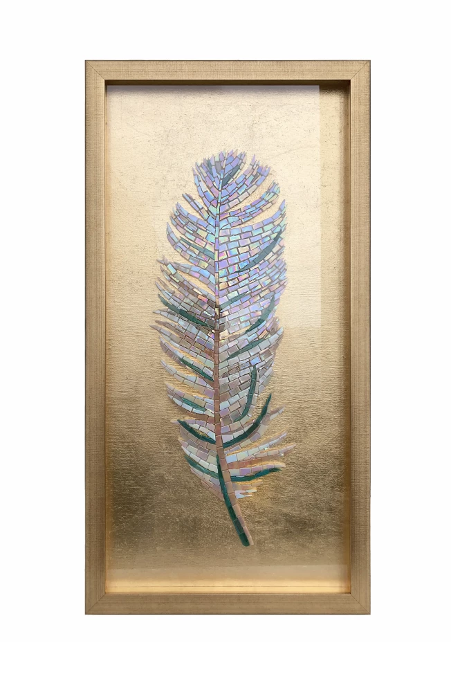 Mosaic feather is created with mother-of-pearl mosaic on gold leaf background