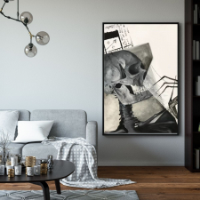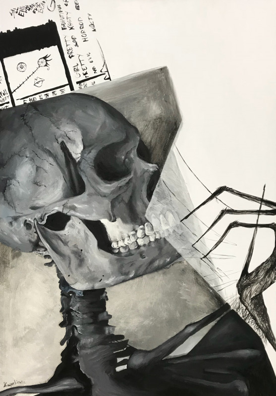 An abstractive vision made by oil technique on canvas from my original art cycle ‘THE FIGURE’. The painting presents a combination of realism and flat graphics in an unsettling and dark atmosphere. Analyzing the whole art piece at first glance we can only see the shabby skeleton, however, after careful second analysis, the skeleton can turn into a shy little girl biting her nails with fear, or a boy whose head evaporates from excessive imagination, that all depends on our individual approach and imagination.