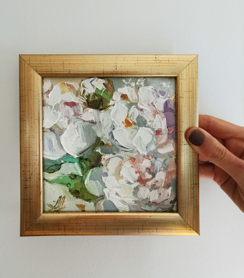 This miniature oil painting features textured paint strokes and gentle shades. Pieces of gold added to the painting shimmer beautifully in the light. Elegant and stylish artwork with white peonies would be a real highlight of your interior.