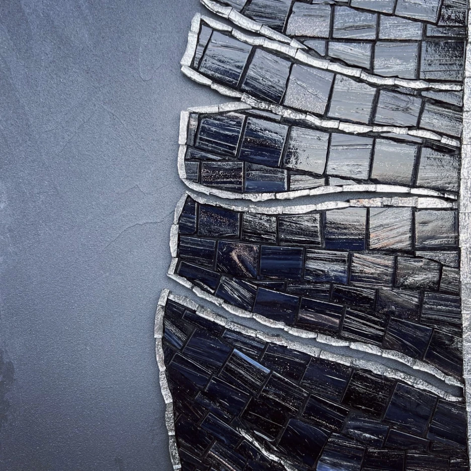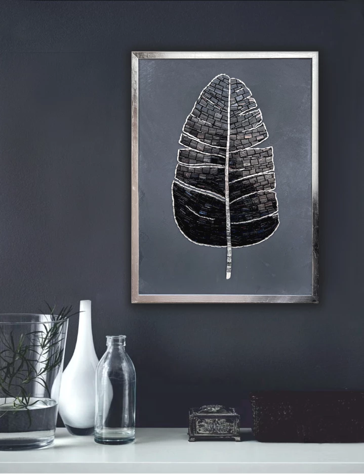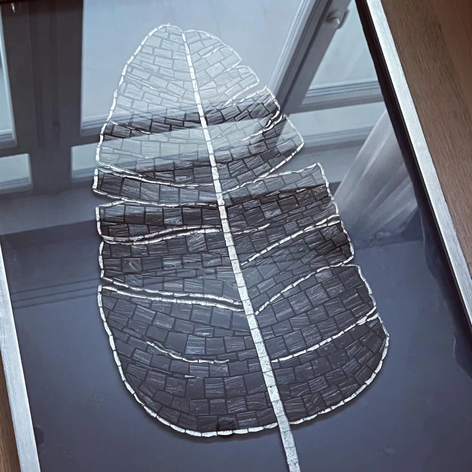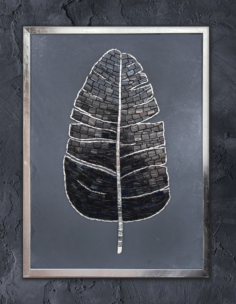 Handcrafted leaf in black glass mosaic, dark grey background.
