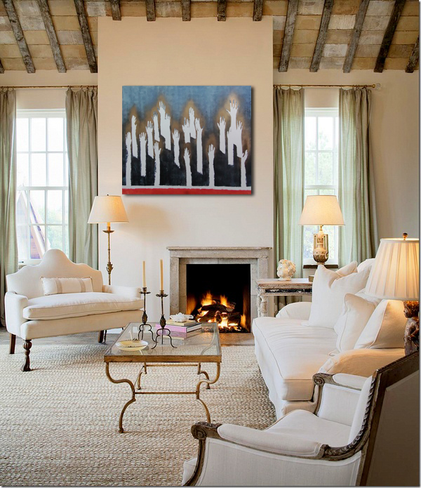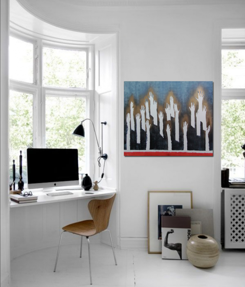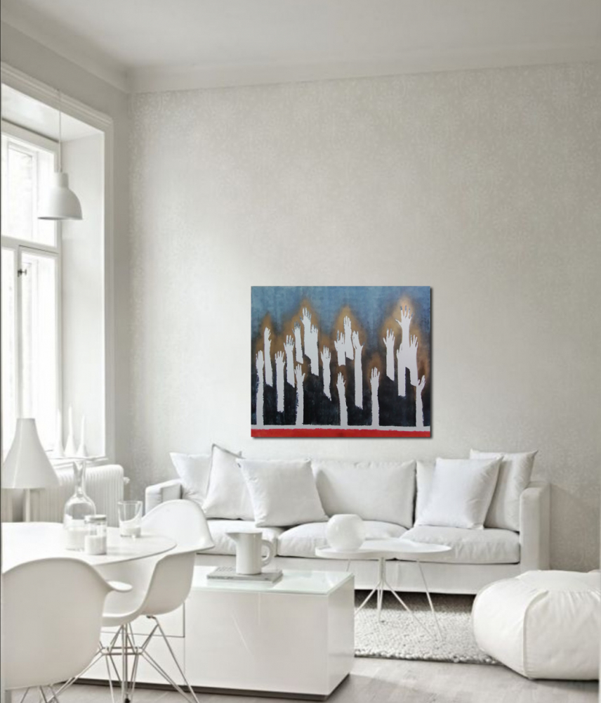 Hands are emerging from the red horizontal line, which is a symbol for the life here, all raised up in the air, seeking a solution, a way out... Their life force as luminescent radiation I presented with golden flows that are brightening the night around...