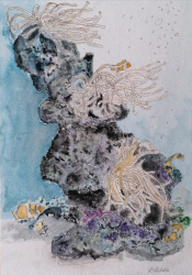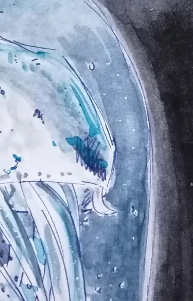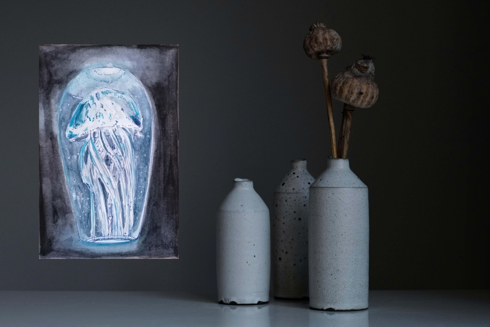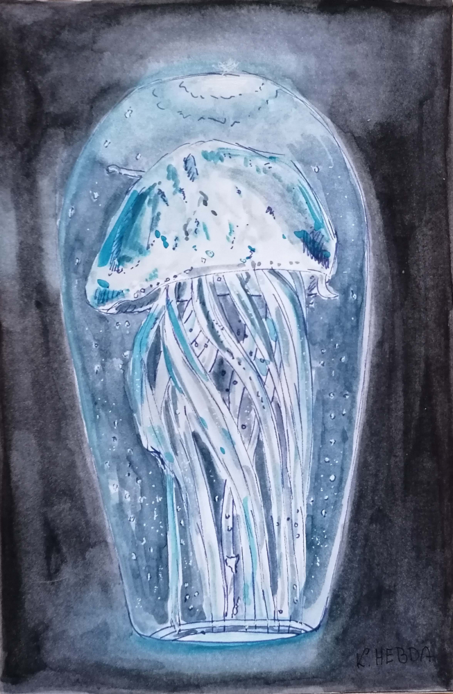 This painting was painted on paper using watercolor and ink. The artist with a realistic style illustrates a jellyfish closed forever in a jar made of glass. With its great style of 12,8x18,9 cm it would fit perfectly to small places or a gallery wall..